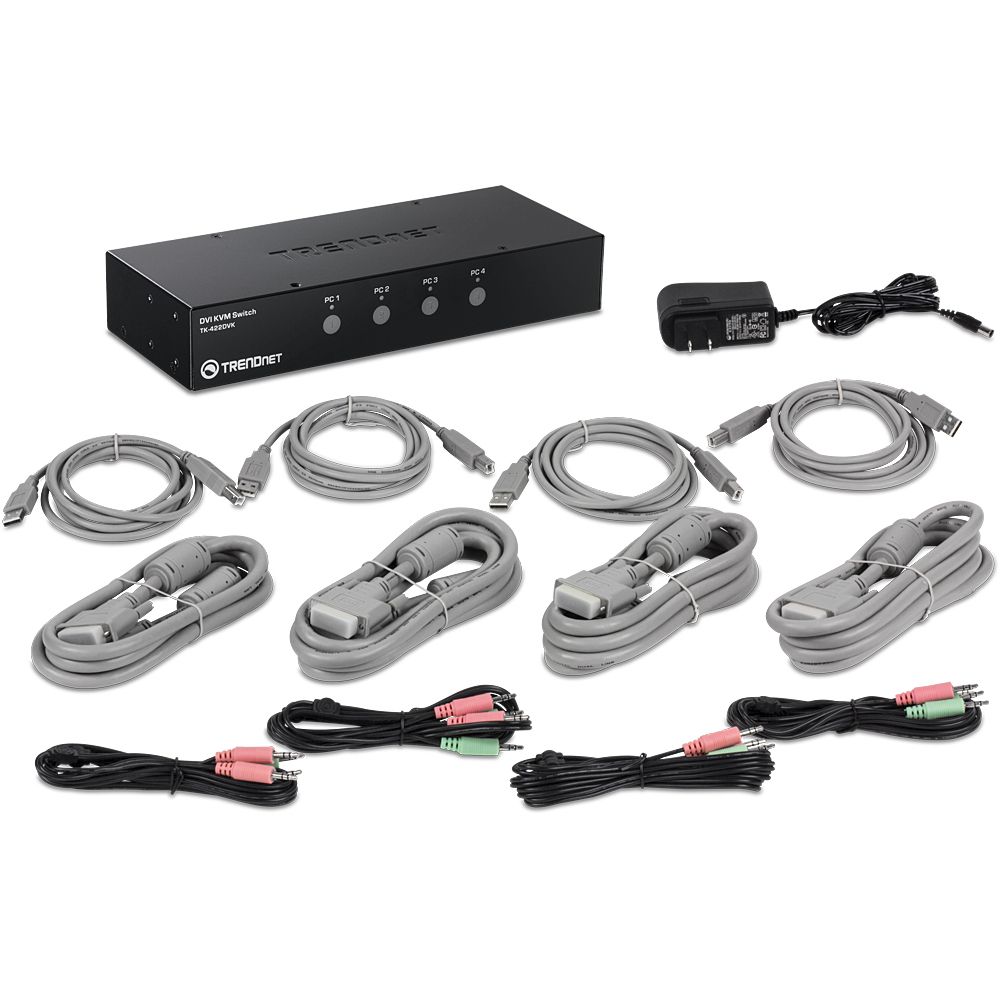 Переключатель, руководство пользователя, внешний адаптер питания, 4 DVI-D KVM-кабеля, 4 аудио-кабеля, 4 кабеля USB A-B