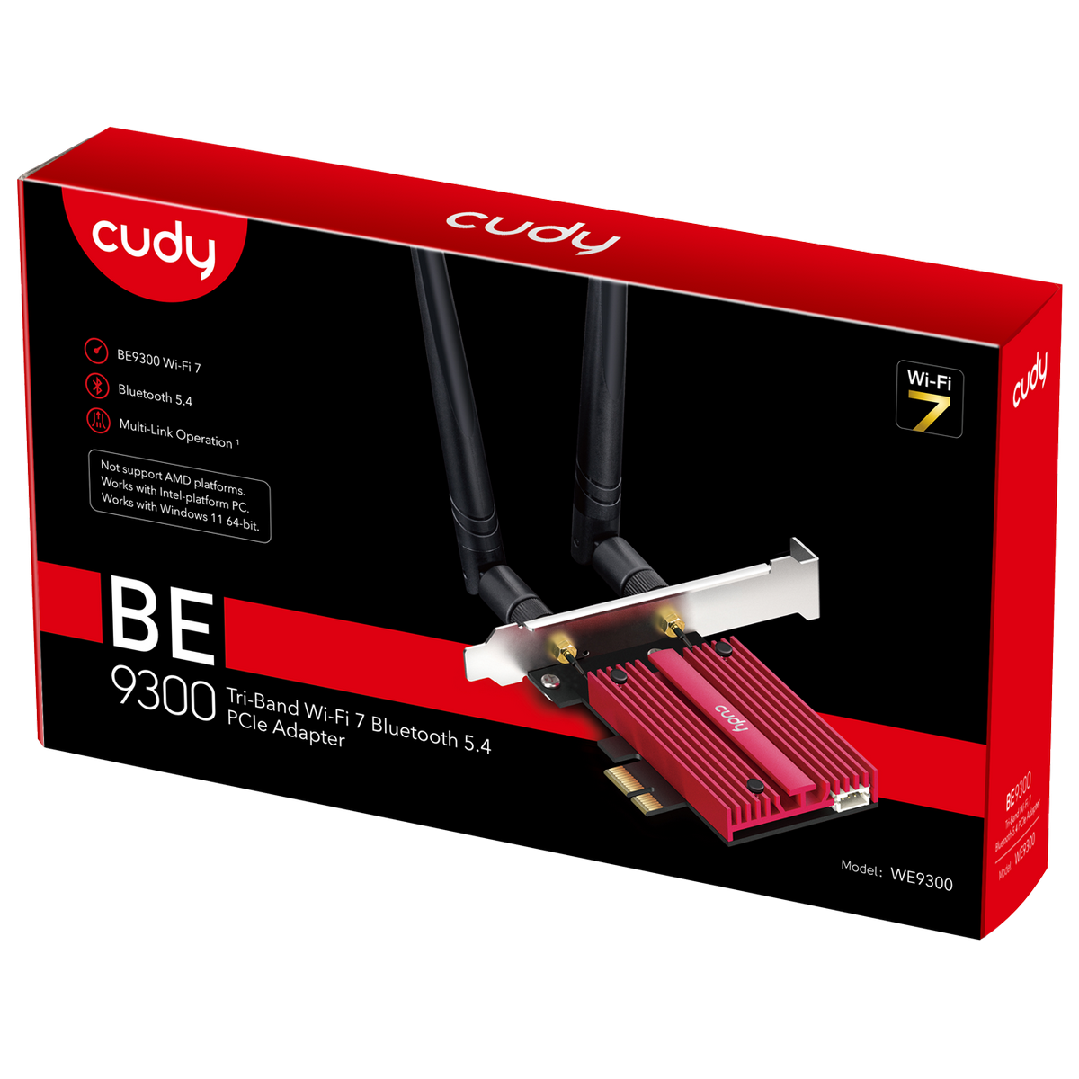 Адаптер беспроводной связи (Wi-Fi) CUDY BE9300 7 PCI Express Adapter 7 Bluetooth 5.4 PCI Express Adapter with Heatsink, Intel BE200 module, Tri-band 2T2R, 5.8Gbps@6Ghz+2.8Gbps@5GHz + 688Mbps@2.4GHz, 802.11be/ax/ac/a/b/g/n, Magnetized antenna base, 2 high gain detachable antennas