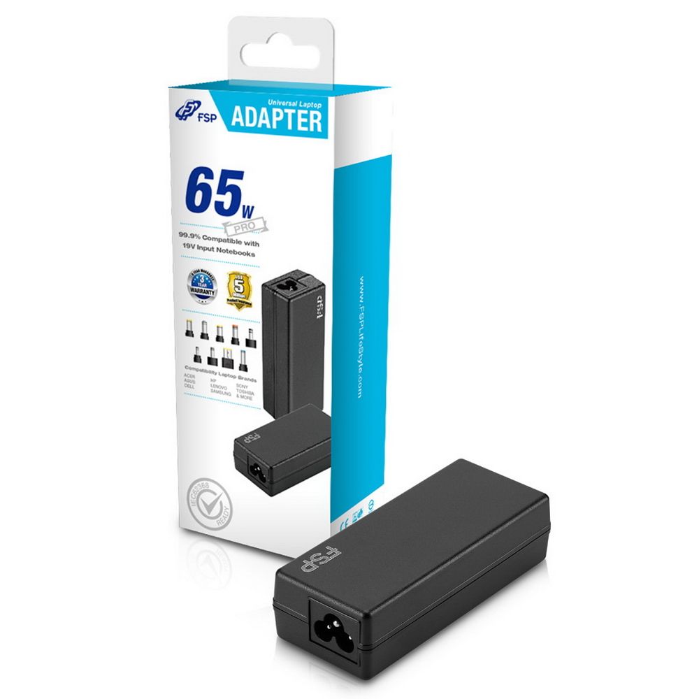 Адаптер питания FSP NB PRO 65 (FSP065-RBBN3) AC-DC 65W Adapter, Вход C6 (для ноутбучного кабеля), Кабель 1500мм, Выход 19V, в комплекте 9 переходников. RETAIL