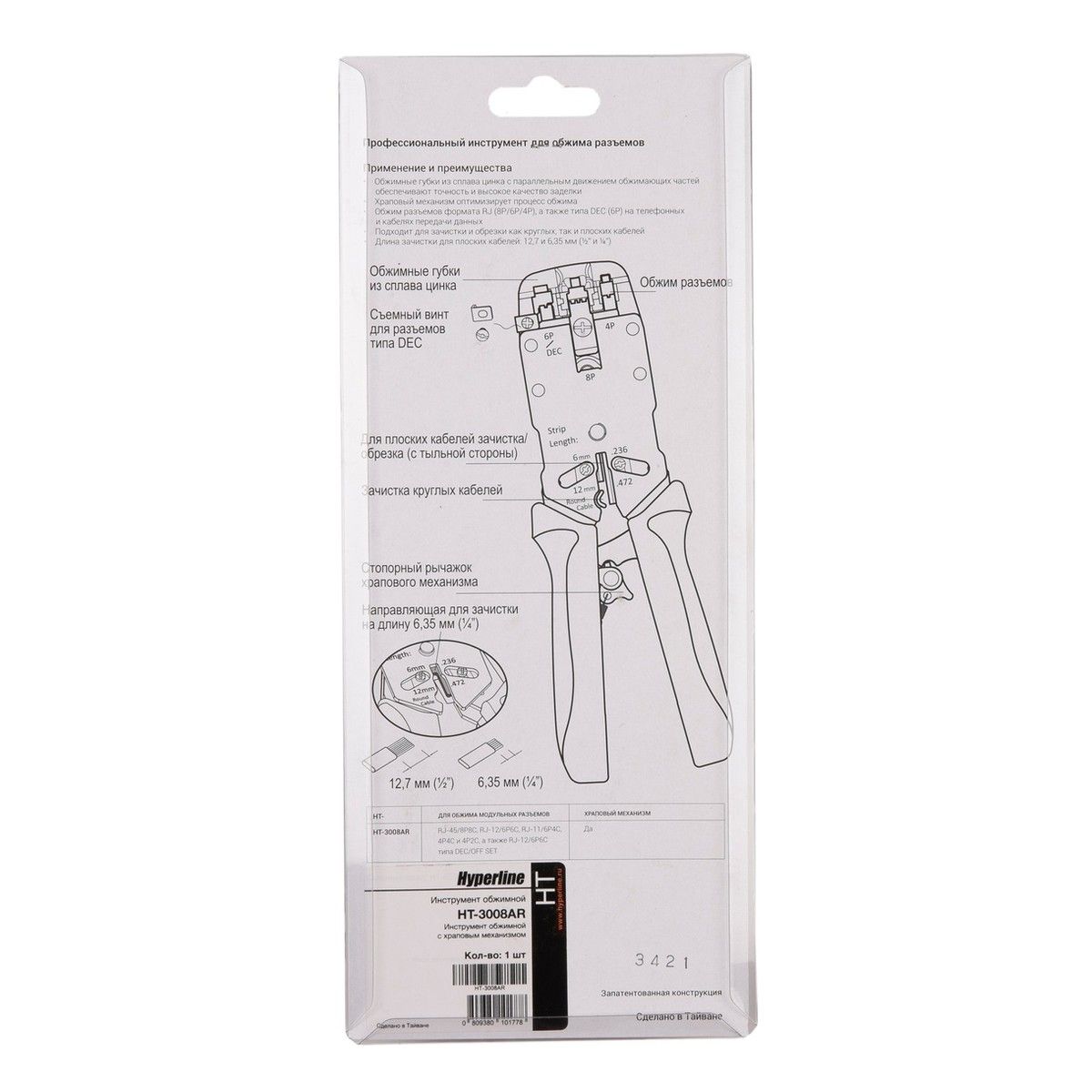 Инструмент обжимной Hyperline HT-3008AR Инструмент обжимной с храповым механизмом, RJ-11 (4P4C),RJ-12(6P6C),RJ-45(8P8C),4P4C,4P2C профессиональный, с храповым механизмом