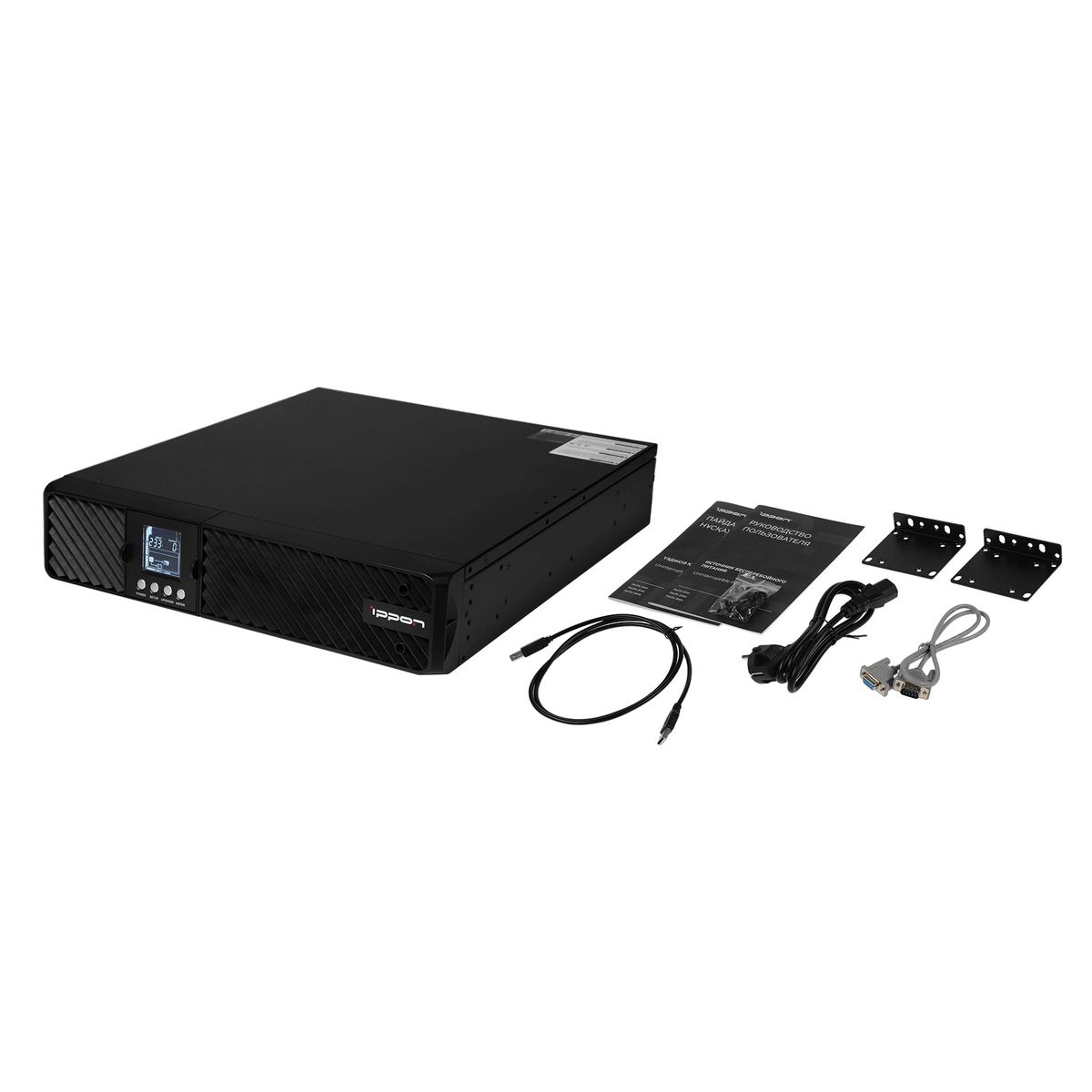 ИБП, кабель питания, USB кабель, монтажные уголки (2шт), крепежный комплект (винты), пылезащитные заглушки, документация