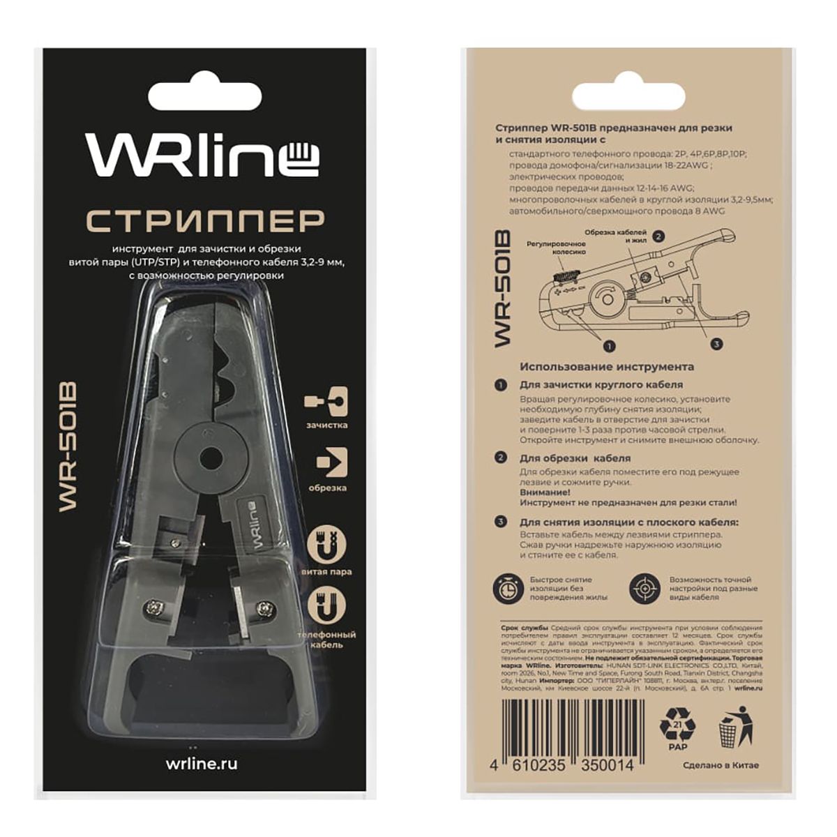 Инструмент обжимной Hyperline WRline WR-501B Стрипер для зачистки и обрезки витой пары (UTP/STP) и телефонного кабеля 3,2-9 мм, с возможностью регулировки