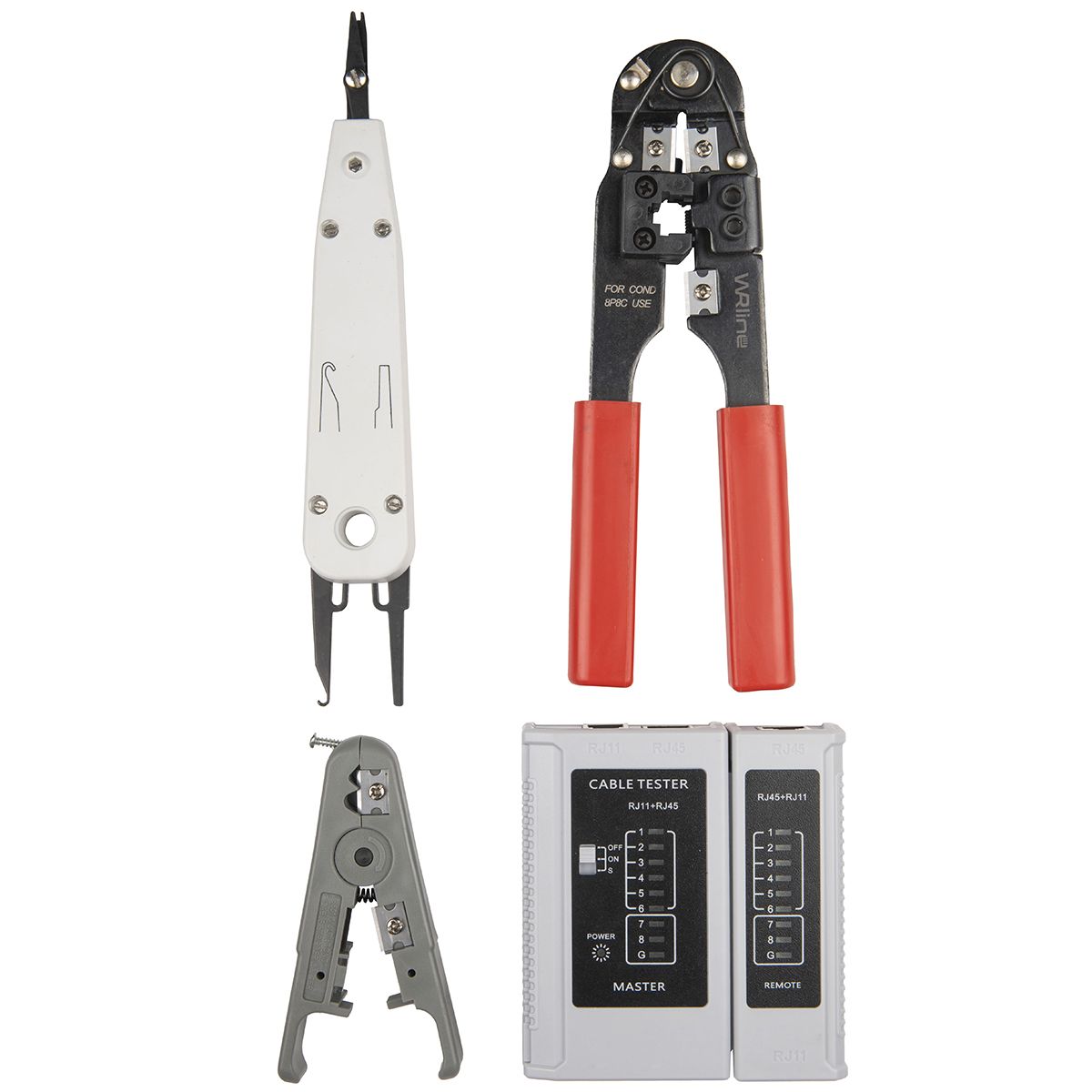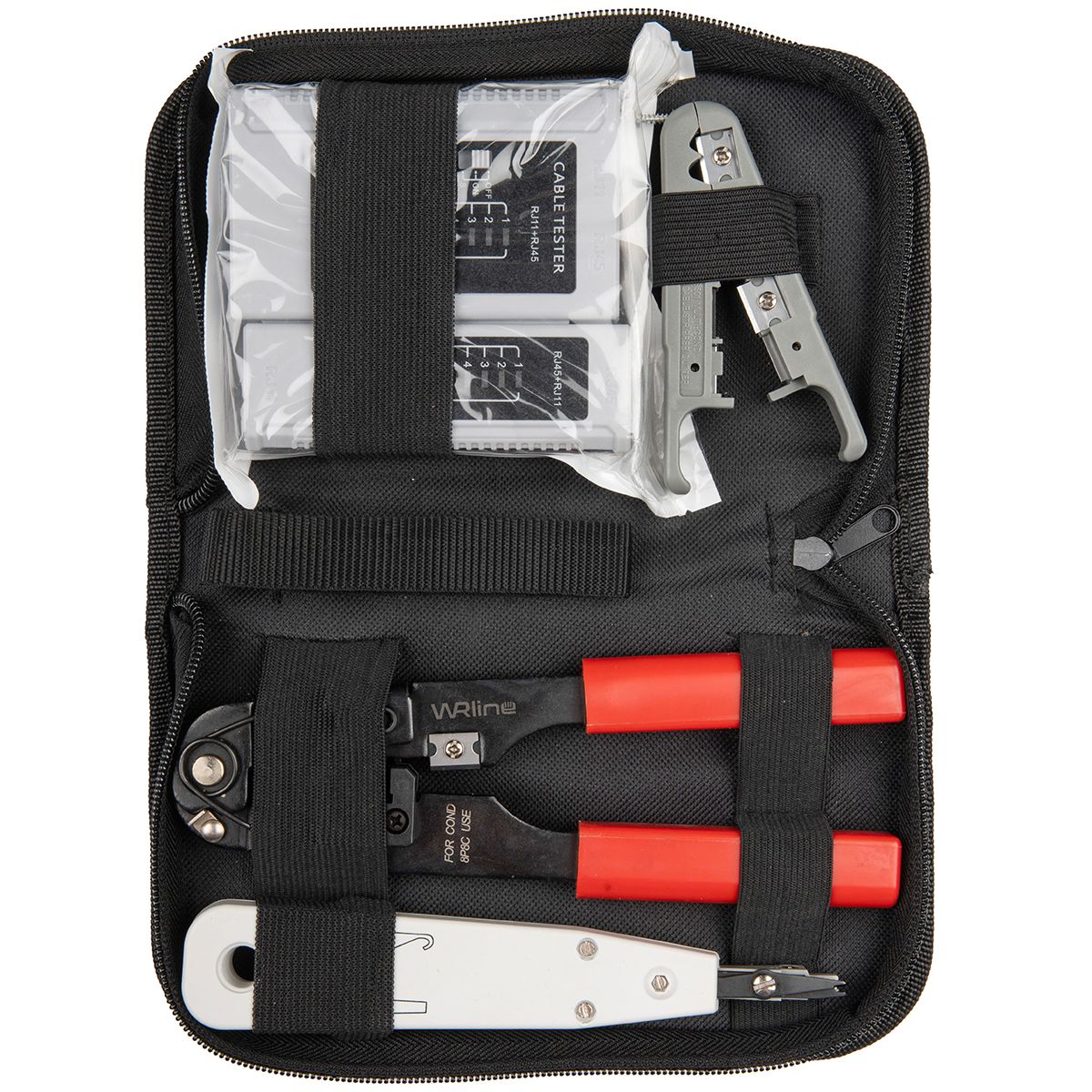 Инструмент для обжима коннекторов RJ-45 (8P8C) угловой, инструмент для зачистки и обрезки кабеля, инструмент для заделки проводников в плинты Krone и контакты Dual IDC, кабельный тестер WR-TK01, пенал