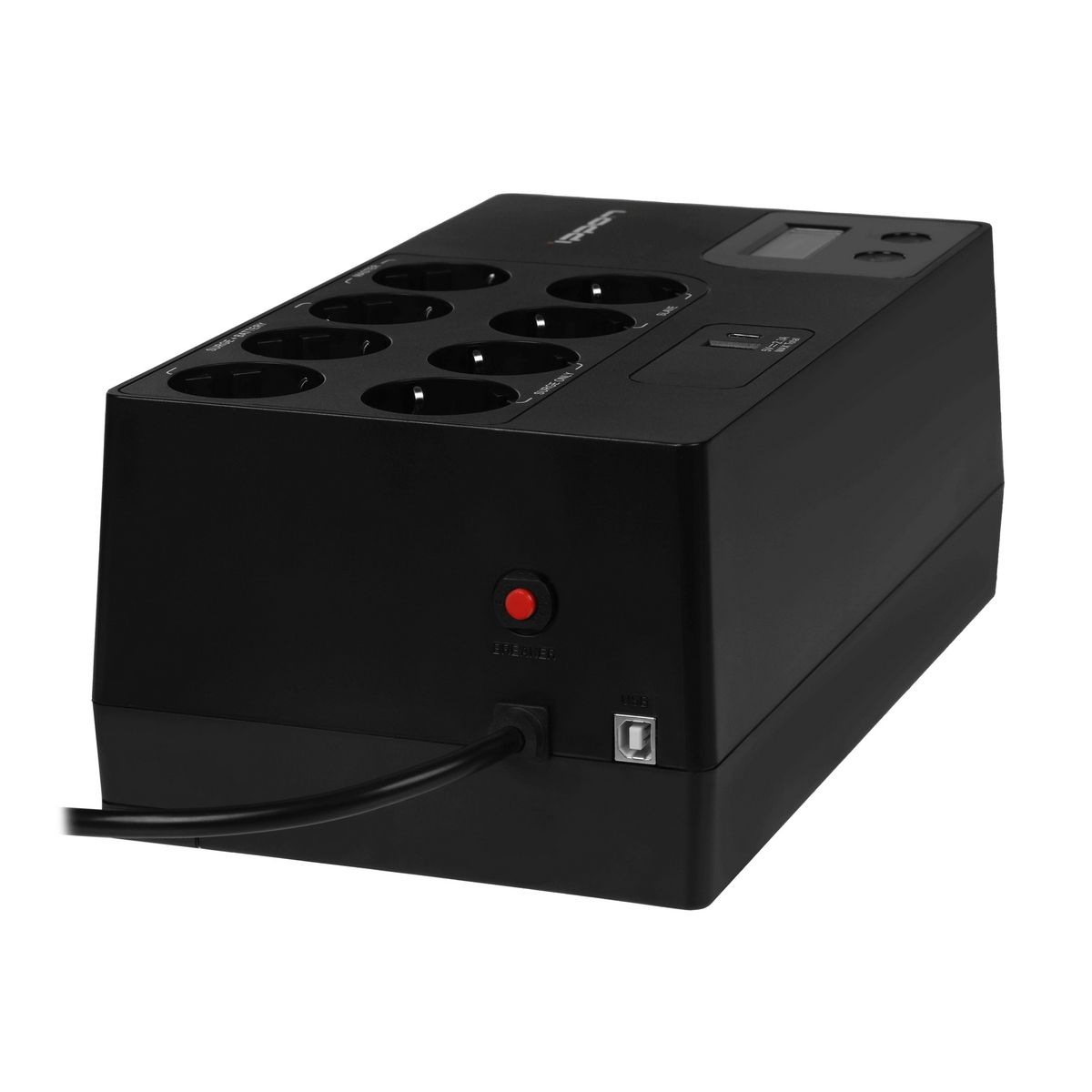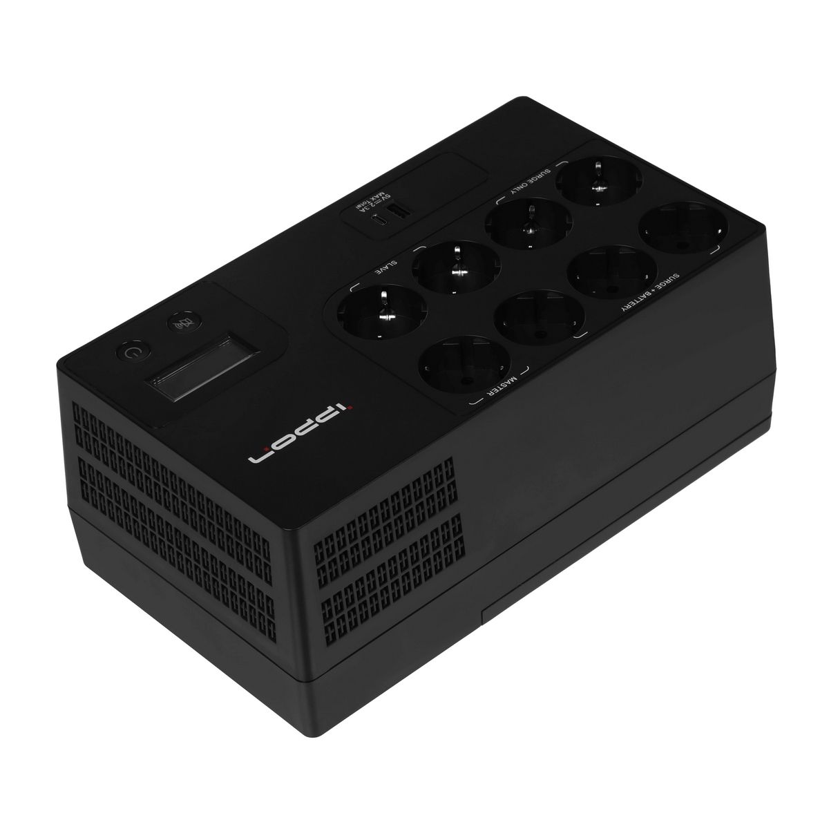 3 розетки Surge + Battery, 1 розетка Master, 2 розетки Surge Only и 2 розетки Slave. Порты USB-A и USB-C 5В (DC) до 2.3A (всего). Кнопки вкл/выкл питания и вкл/выкл сигнала. ЖК-экран с информацией о работе ИБП
