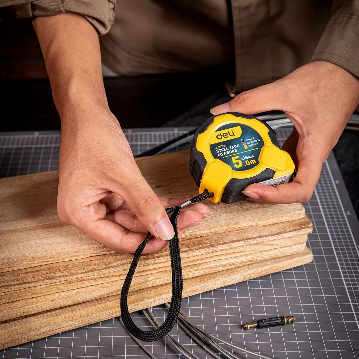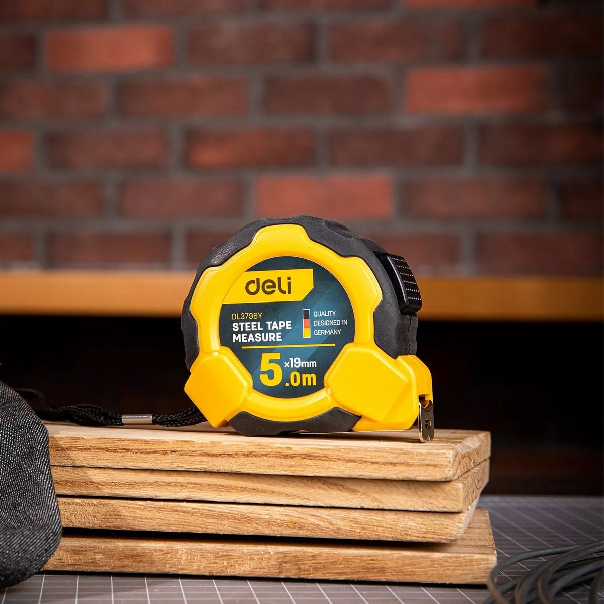 Рулетка Deli DL3796 5м*19мм, Автостоп, ударопрочный корпус, метрическая
