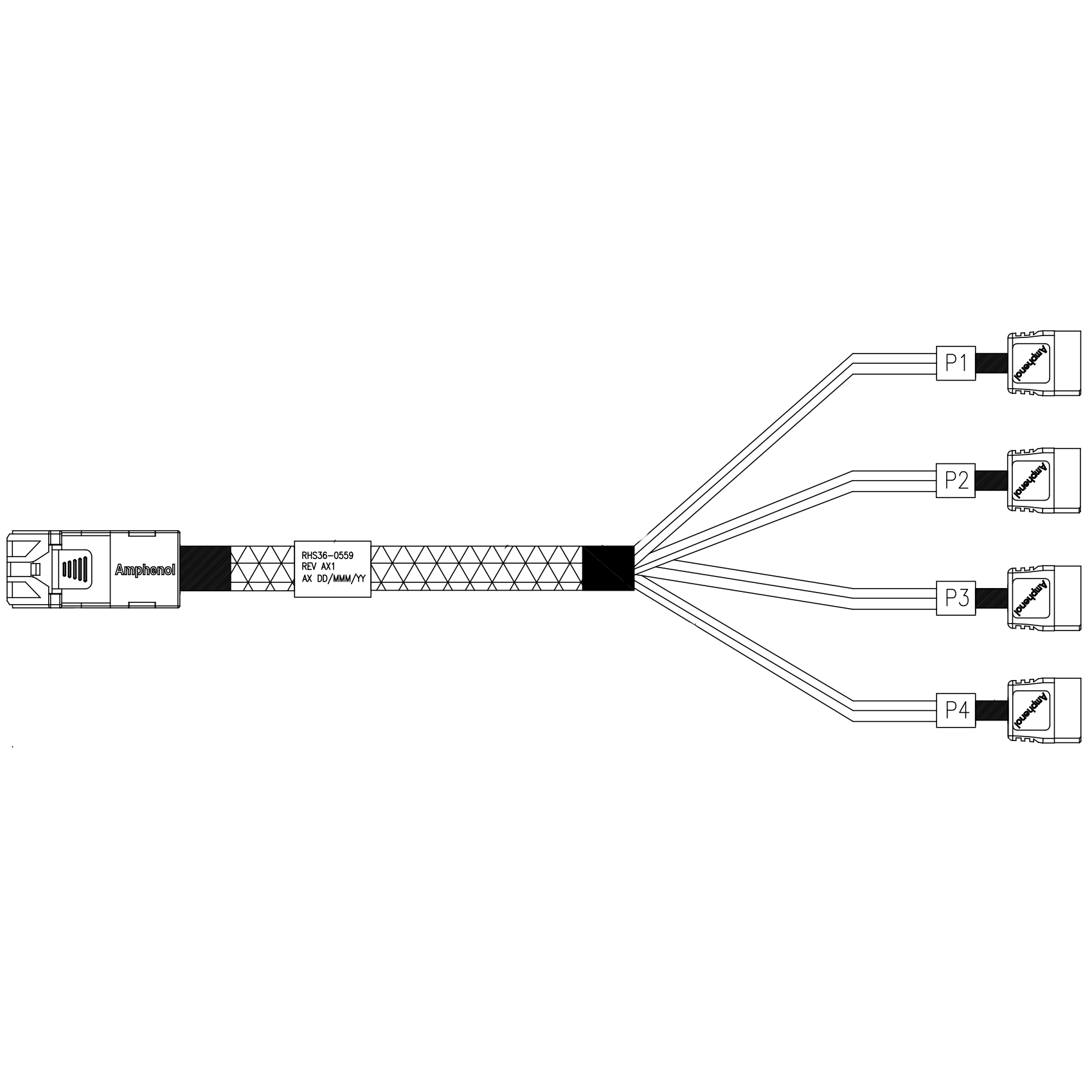 Кабель Amphenol RHS36-0559 HDmSAS SFF8643 -to- 4*SATA, SAS 2.1 (6G), 100cm (C43SATA)