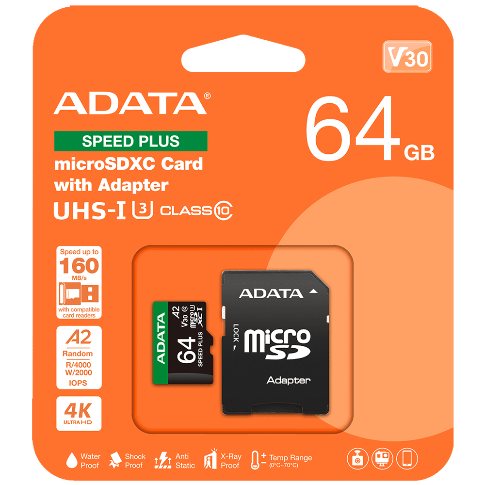 Карта памяти microSDXC 64GB ADATA Speed Plus UHS-I U3/V30/A2, up to 180/160 MB/s, Durable (Water-/Shock-/X-Ray-Proof)