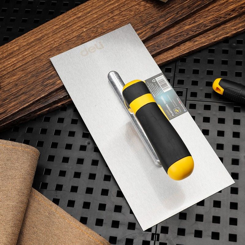 Кельма штукатурная Deli — это незаменимый инструмент для отделочных работ. Она изготовлена из качественных материалов, что обеспечивает долговечность и надёжность в использовании. Прямоугольная форма кельмы позволяет наносить и разравнивать различные виды строительных смесей, обеспечивая гладкую поверхность без неровностей.