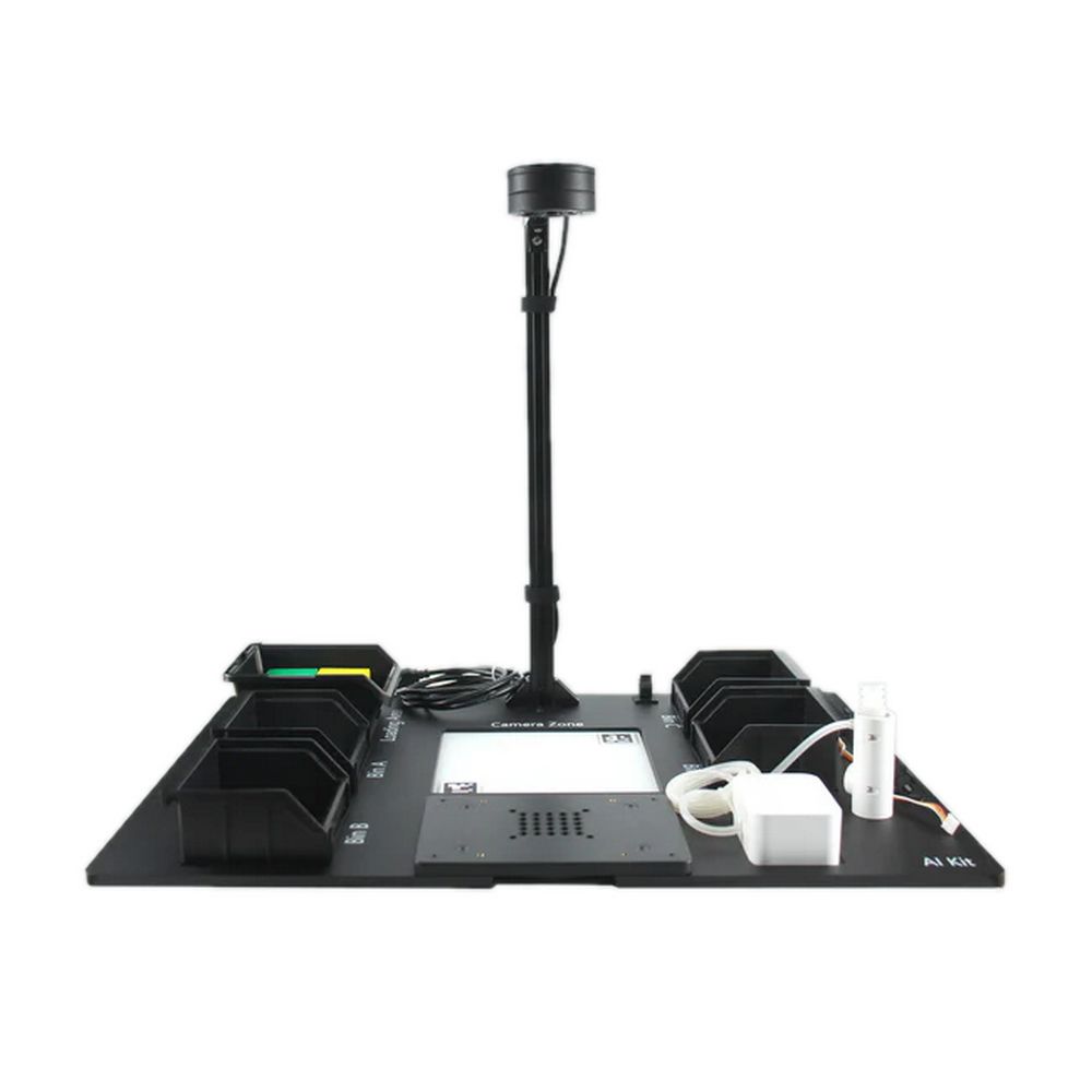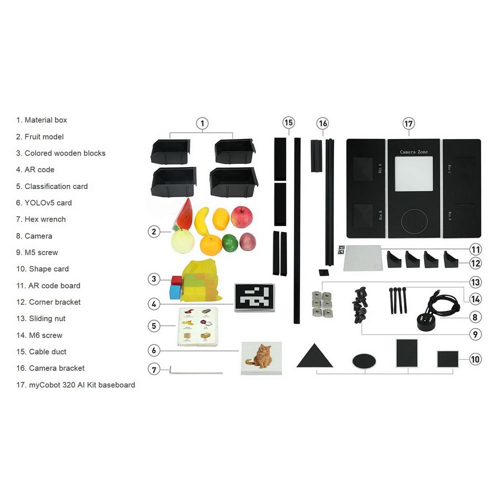 Робот-манипулятор, документация, адаптер питания с кабелем питания, шестигранный ключ для установки, 2 крепежные струбцины, 4 пластиковых контейнера, подставка для камеры, камера с кабелем и защитой для кабеля, крепеж (винты, гайки), база для установки манипулятора, адаптивный механический захват, присоска-насос для мелких предметов + кабель, наборы деревянных блоков, моделей фруктов и карточек с изображениями, акриловое основание для комплекта