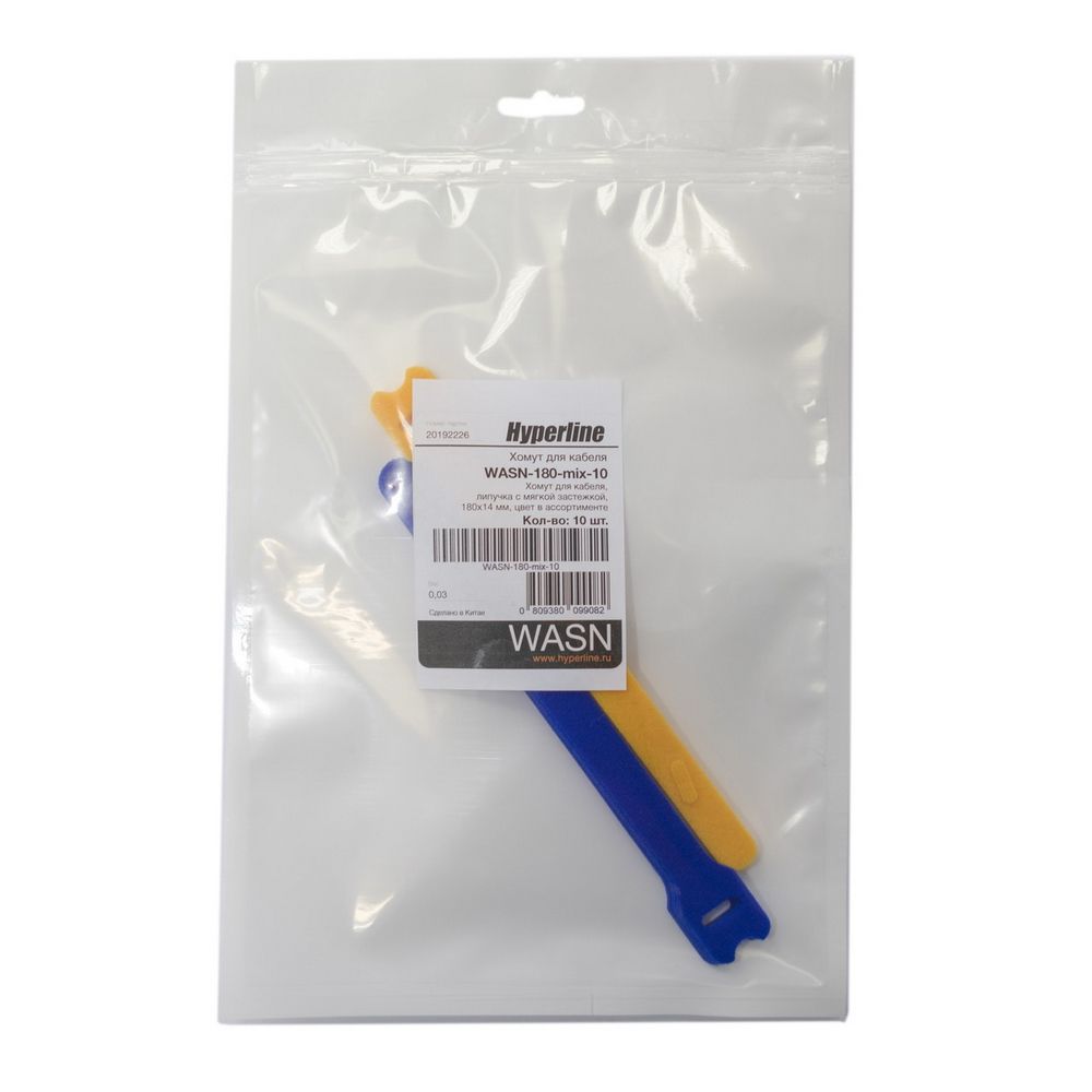 Крепеж Hyperline WASN-180-mix-10 Хомут для кабеля, липучка с мягкой застежкой, 180x14мм, цвет в ассортименте (10шт.)
