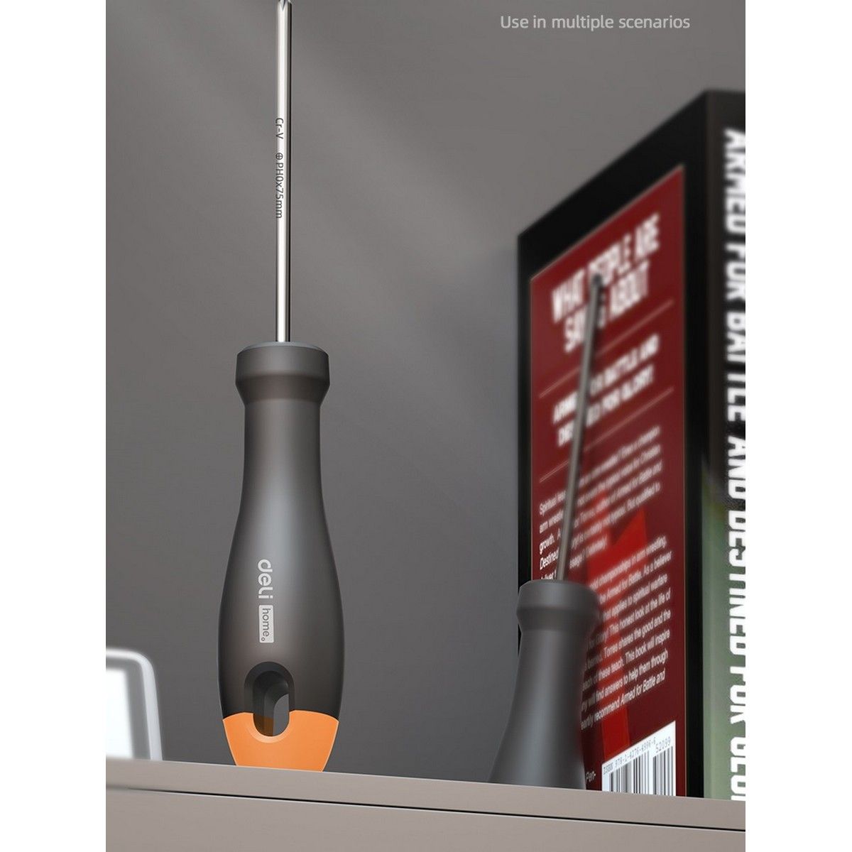 Отвёртка Deli из серии Home Series Gray — это незаменимый инструмент для любого мастера. Она имеет крестообразный наконечник PH0 и длину 75 миллиметров, что позволяет работать с различными крепежами.
