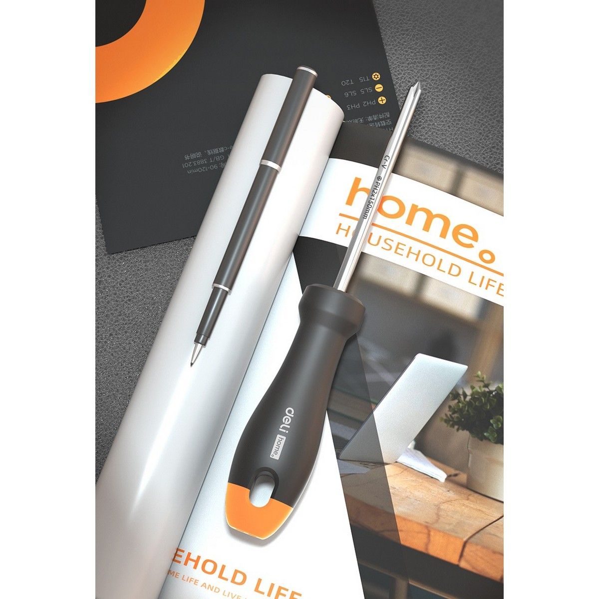 Отвёртка Deli серии Home Series Gray — это незаменимый инструмент для любого мастера или домашнего умельца. Она имеет крестообразный наконечник PH2 и длину 150 миллиметров, что позволяет работать с различными крепежными элементами.