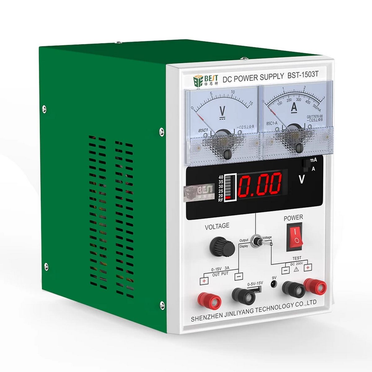 Блок питания BST-1503T оснащён цифровым и аналоговым дисплеем, который позволяет точно контролировать выходное напряжение и ток. Это делает его удобным инструментом для проведения точных измерений и экспериментов.