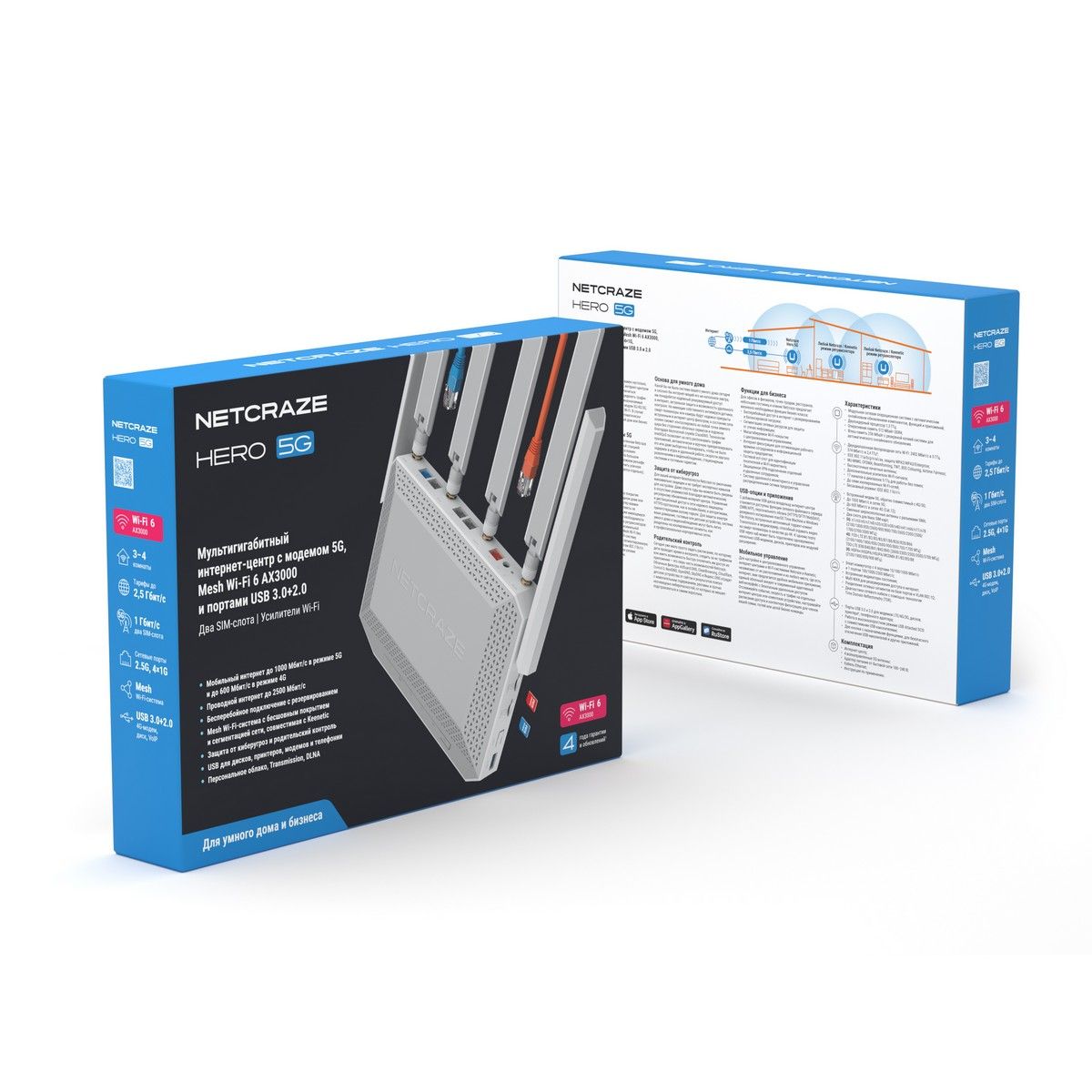 Маршрутизатор NETCRAZE (Keenetic) Netcraze Hero 5G (NC-4110) Мультигигабитный интернет-центр с модемом 5G, двумя слотами для SIM-карт, Mesh Wi-Fi 6 AX3000, Smart- коммутатором 1×2.5G и 4×1G, многофункциональными портами USB 3.0 и 2.0