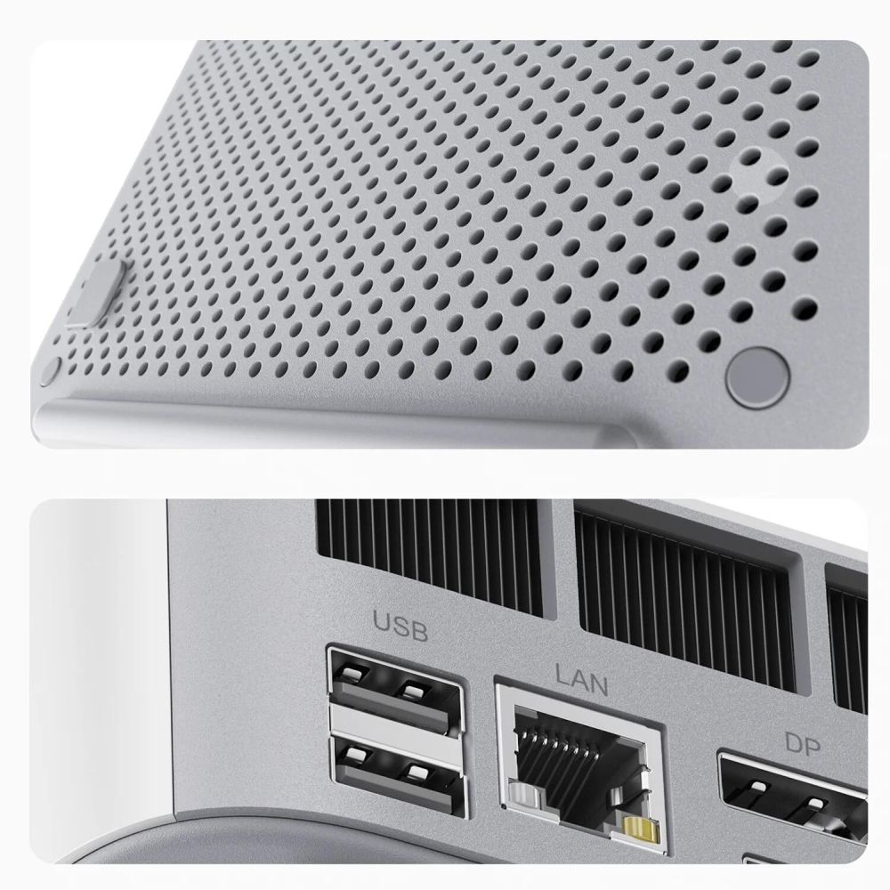 - Компактность и стиль: форм-фактор SFF (slim form-factor) и серебристый корпус делают этот мини-ПК отличным решением для любого рабочего места.