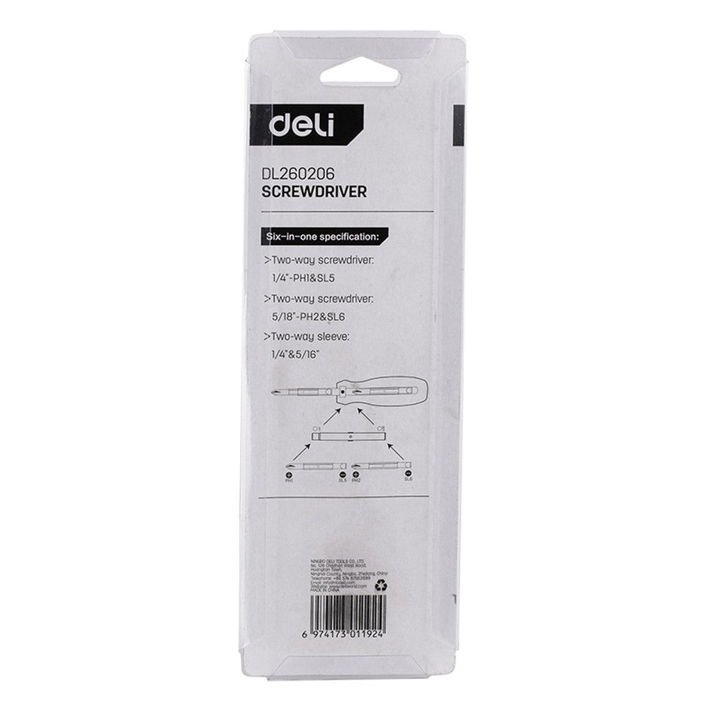 Многофункциональная отвертка 6-в-1 Deli DL260206 длина 180мм, в комплекте биты SL5+PH1 и SL6+PH2, удлинитель, прорезиненная рукоять