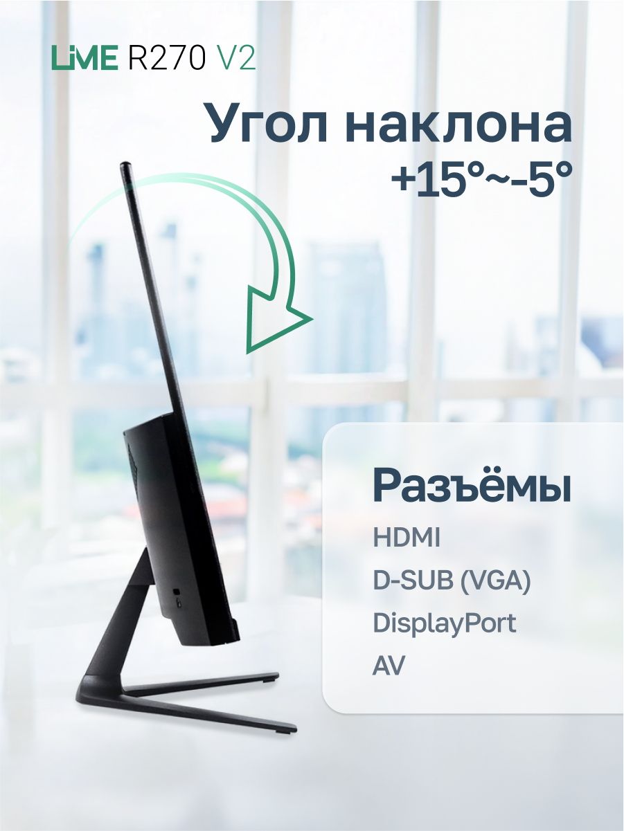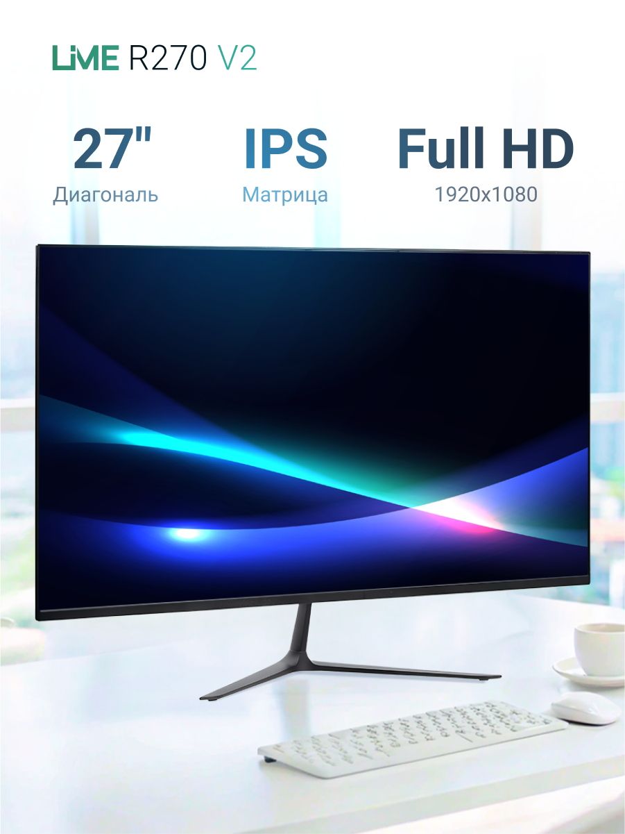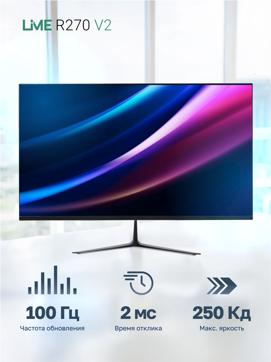 Монитор 27" Lime R270 V2 Black (IPS, 1920x1080, VGA+HDMI+DP+Audio out, 2 ms (GtG), 178°/178°, 250 cd/m, 1000:1 (100M:1), 100Hz, Flat, внутр. БП)