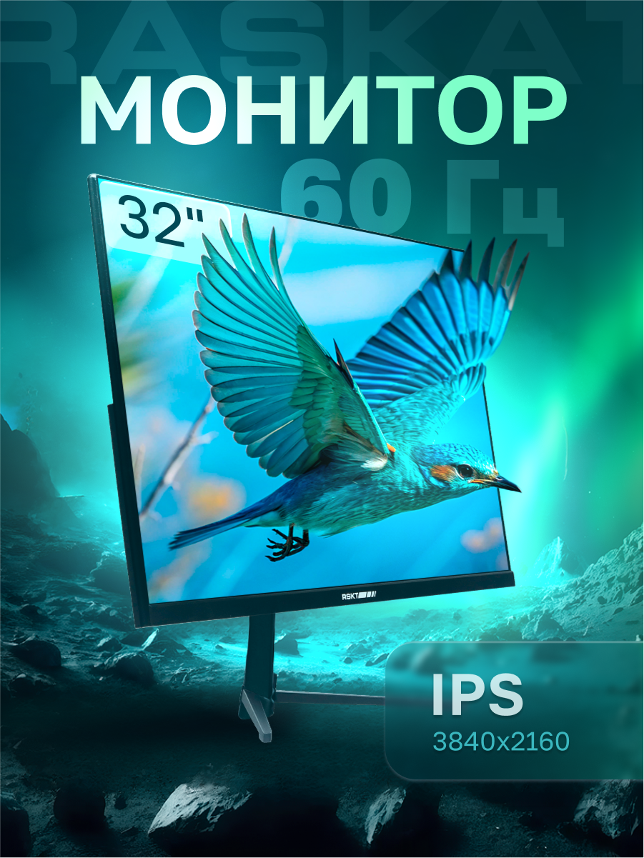 Монитор Raskat 32" I32U6D (IPS, 3840×2160, HDMI+DP+Audio output, 5 ms, 178°/178°, 1000:1, 60Hz, Black)