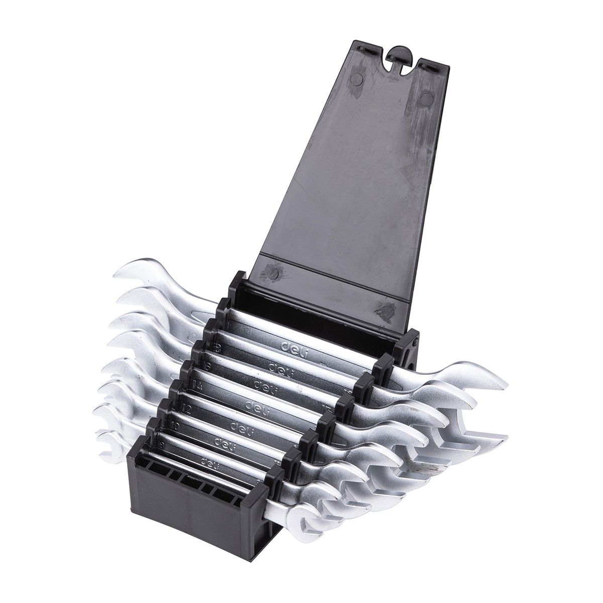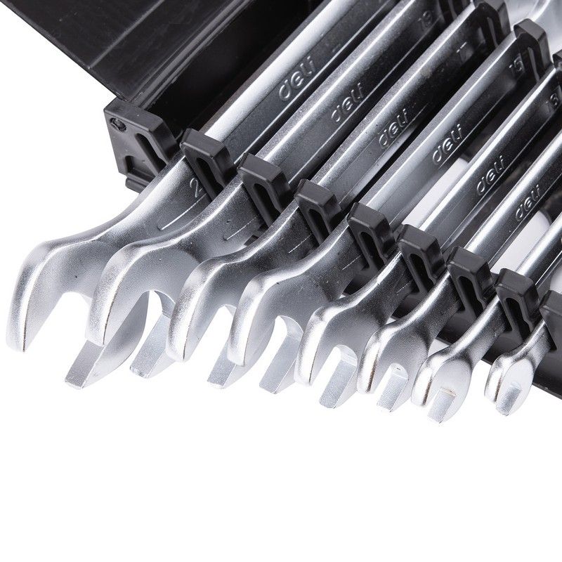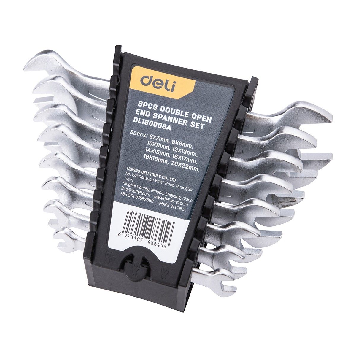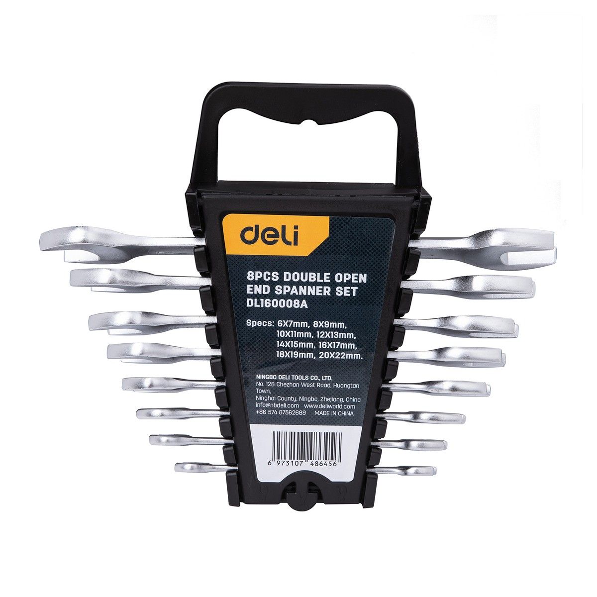 Набор двусторонних гаечных ключей 8 шт Deli DL160008A размеры 6x7, 8x9, 10x11, 12x13, 14x15, 16x17, 18x19, 20x22 мм, матовая хромированная поверхность, пластиковый кейс