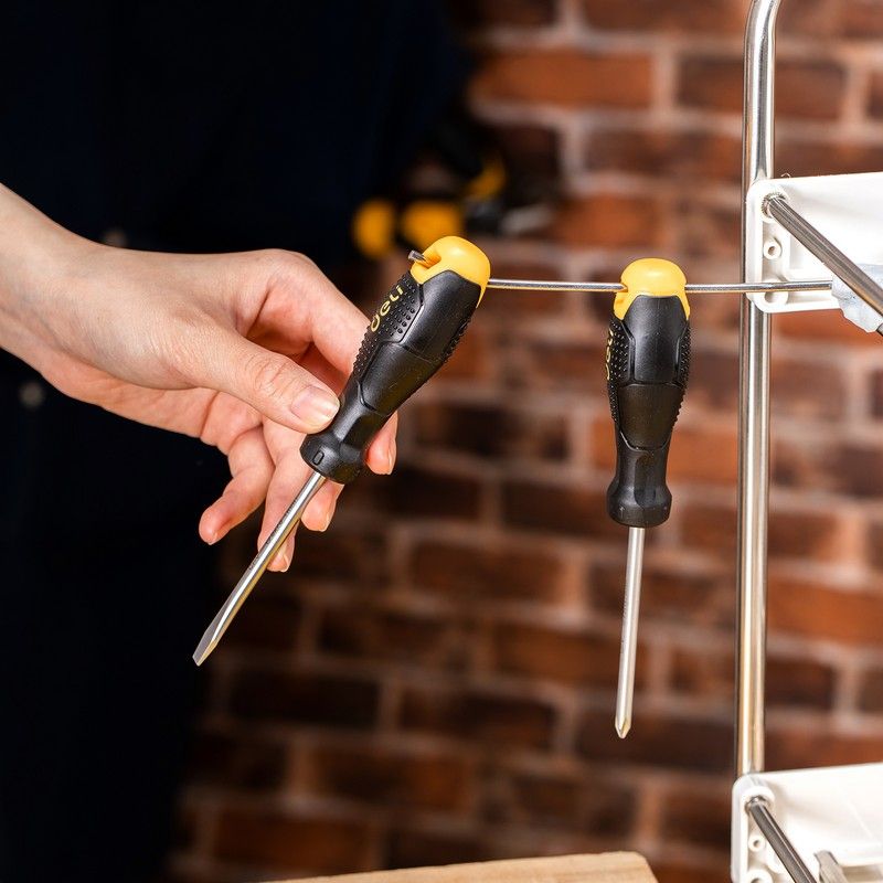 Отвёртки изготовлены из качественных материалов, что обеспечивает их долговечность и надёжность. Эргономичная ручка удобно лежит в руке и не скользит, что позволяет работать с инструментом без усталости.