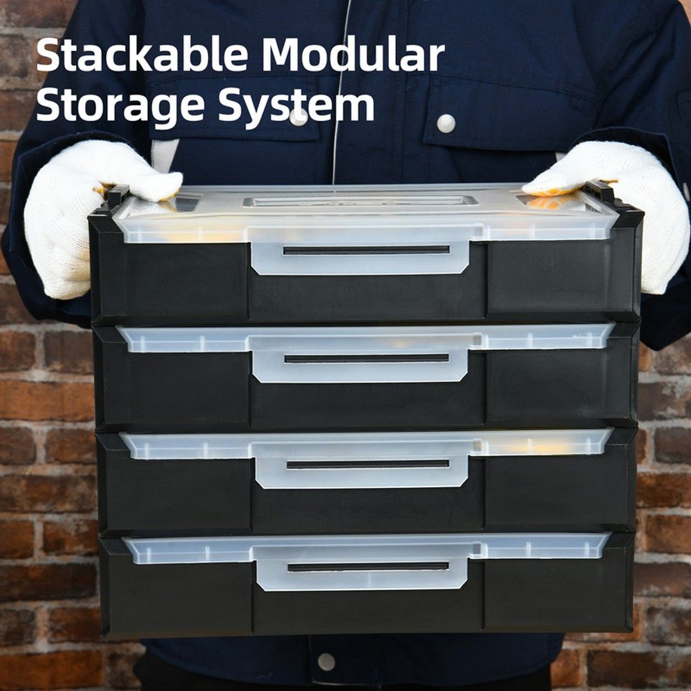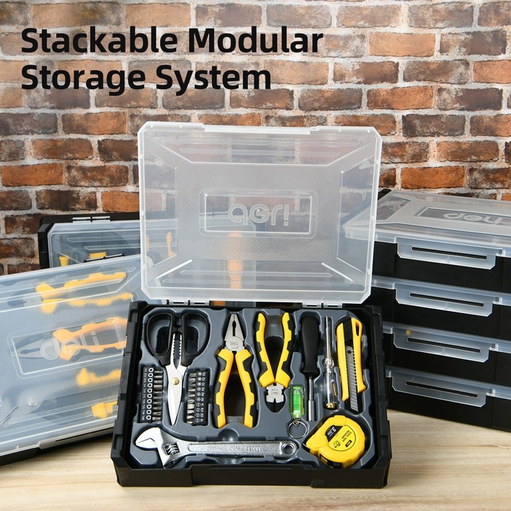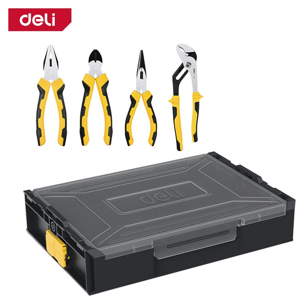 Набор шарнирно-губцевого инструмента Deli DL1204 (комбинированные плоскогубцы 200мм, удлиненные плоскогубцы 160мм, диагональные бокорезы 160мм, переставные клещи 250мм), штабелируемый пластиковый органайзер