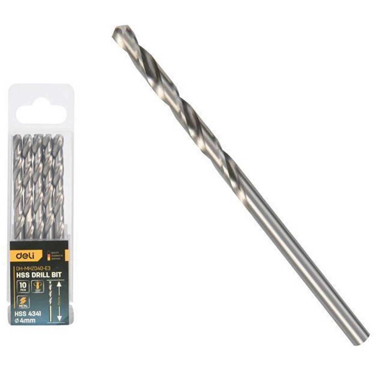 Набор сверл по металлу (4мм, 10 шт) Deli DH-MHZ040-E3 сталь HSS 4341, угол заточки 135 град, пласт. кейс