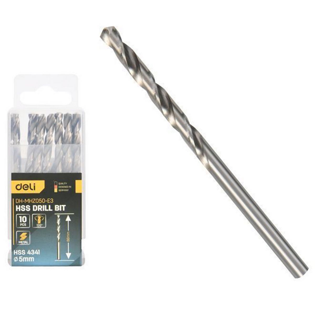 Набор сверл по металлу (5мм, 10 шт) Deli DH-MHZ050-E3 сталь HSS 4341, угол заточки 135 град, пласт. кейс