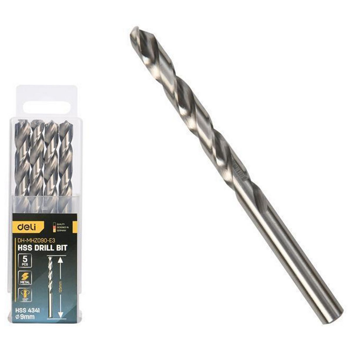 Набор сверл по металлу (9мм, 5 шт) Deli DH-MHZ090-E3 сталь HSS 4341, угол заточки 135 град, пласт. кейс