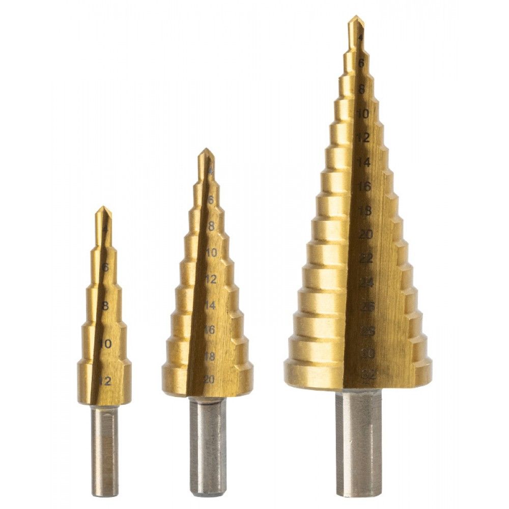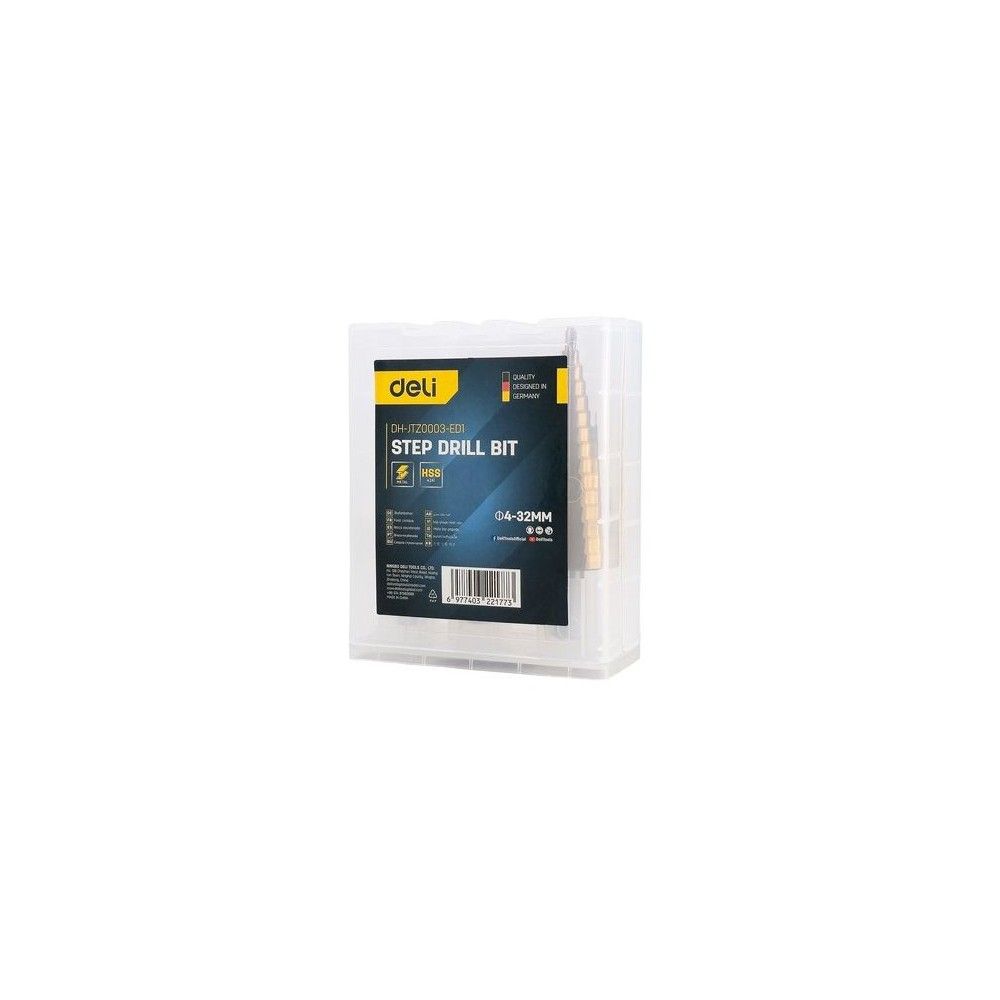 Набор сверл ступенчатых по металлу (3 шт) Deli DH-JTZ0003-ED1 (4-12мм, 4-20мм, 4-32мм, HSS 4241, цилиндрический хвостовик, прямая канавка)