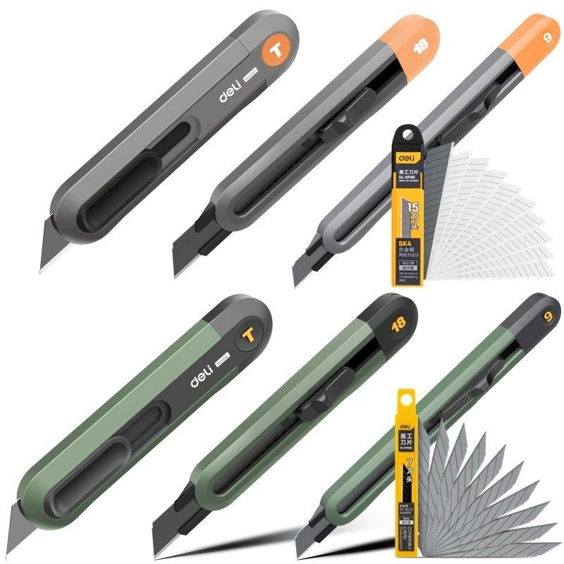 Набор технических ножей "Home Series Green" Deli HT4003L (ножи 9мм+18мм+Т-образный), эксклюзивный дизайн, корпус из высококачественного софттач пластика