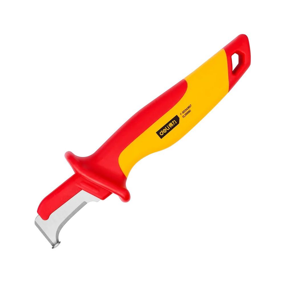 Нож электрика диэлектрический изогнутый с "пяткой" Deli DL515180 180мм, нержавеющая сталь, сертификат VDE для работ под напряжением до 1000 В, чехол для режущей части