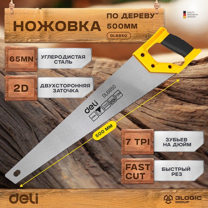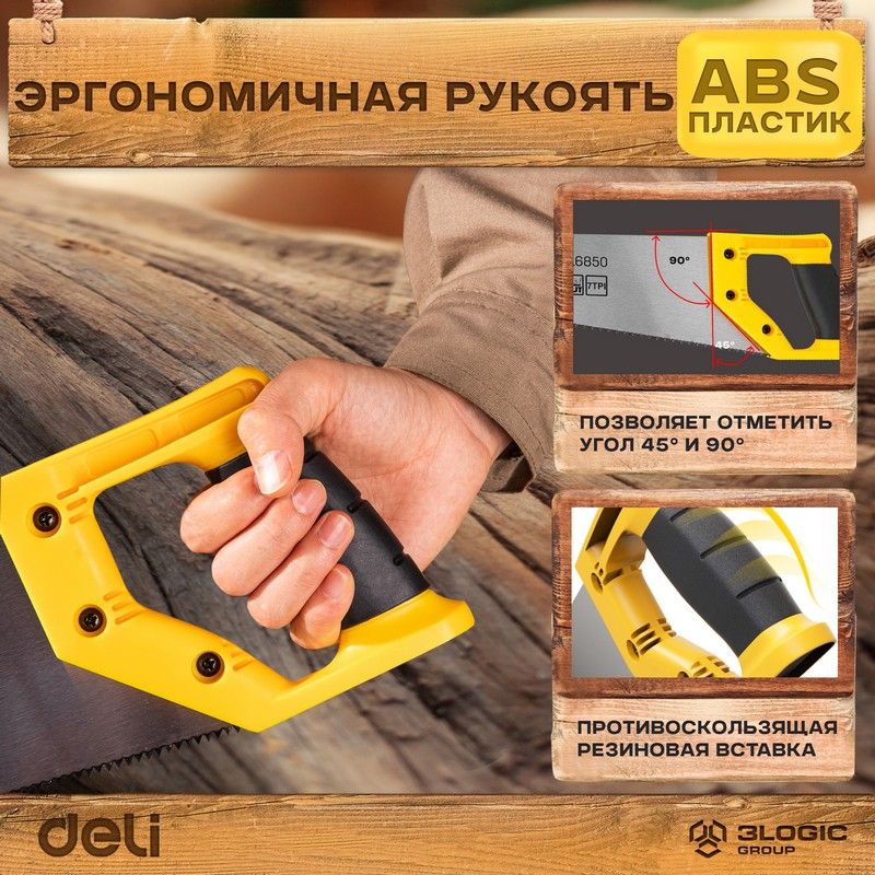 Ножовка по дереву Deli DL6850 500мм, сталь 65Mn, шлифовка зубцов с 2-х сторон, литая рукоять из двухкомпонентного противоударного пластика