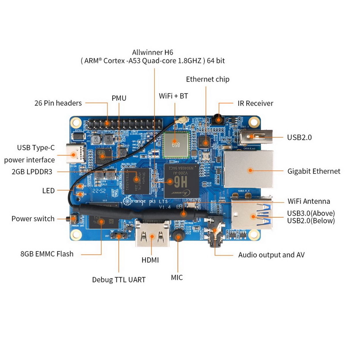 Orange Pi 3 LTS — это компактный и мощный одноплатный компьютер, который станет отличным выбором для различных проектов. Он оснащён четырёхъядерным процессором Allwinner H6 и графическим ускорителем Mali-T720MP2, что обеспечивает высокую производительность и позволяет запускать множество приложений.
