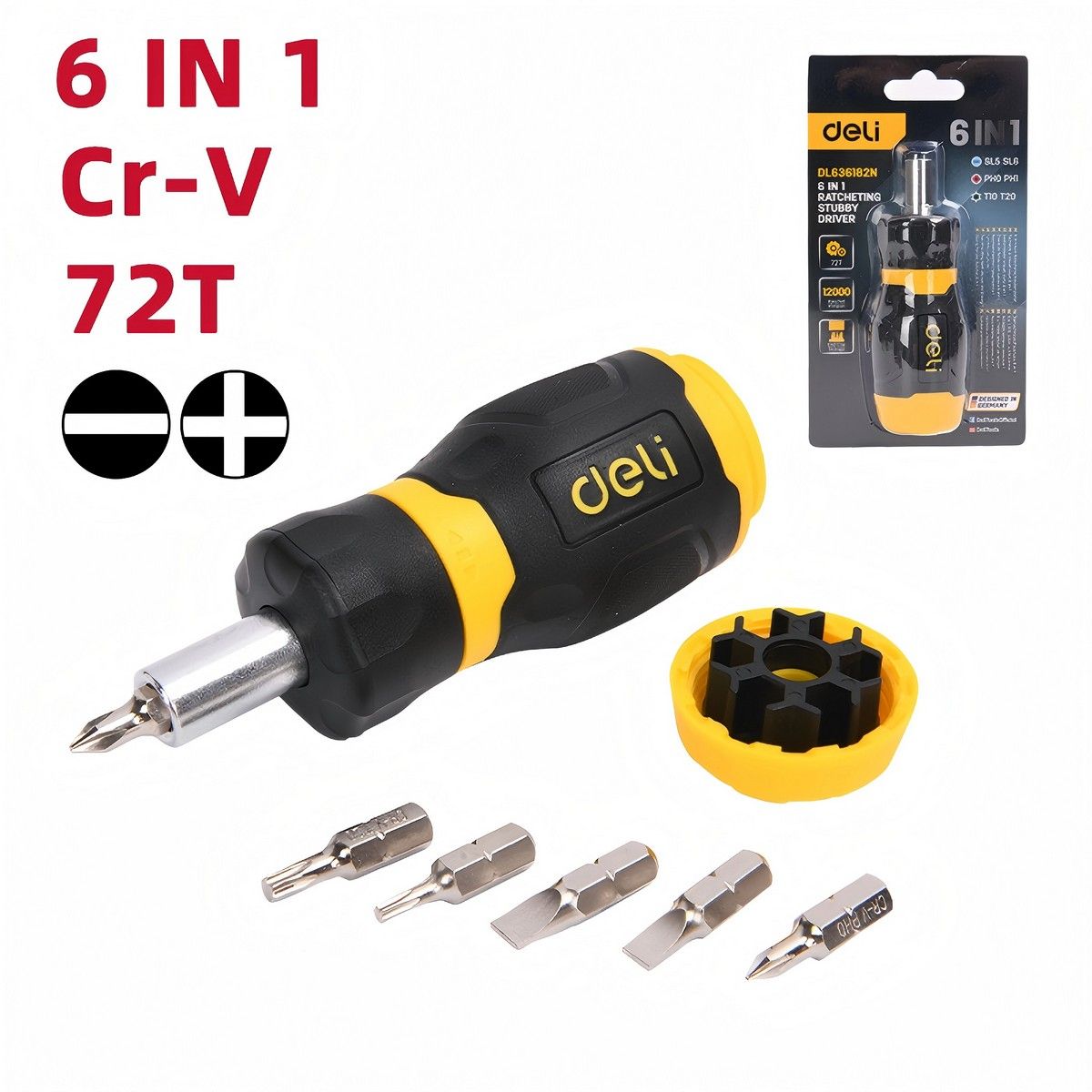 Отвертка с трещоткой с набором бит 6-в-1 Deli DL636182N 6 бит Cr-V (SL5,SL6,PH0,PH1,T10,T20), трещотка 72 зуба