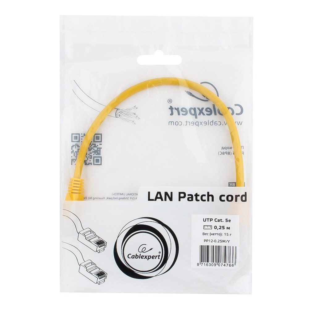Кабель Cablexpert Патч-корд UTP PP12-0.25M/Y кат.5e, 0.25м, литой, многожильный (жёлтый) (074766) {50}