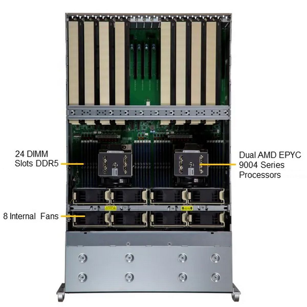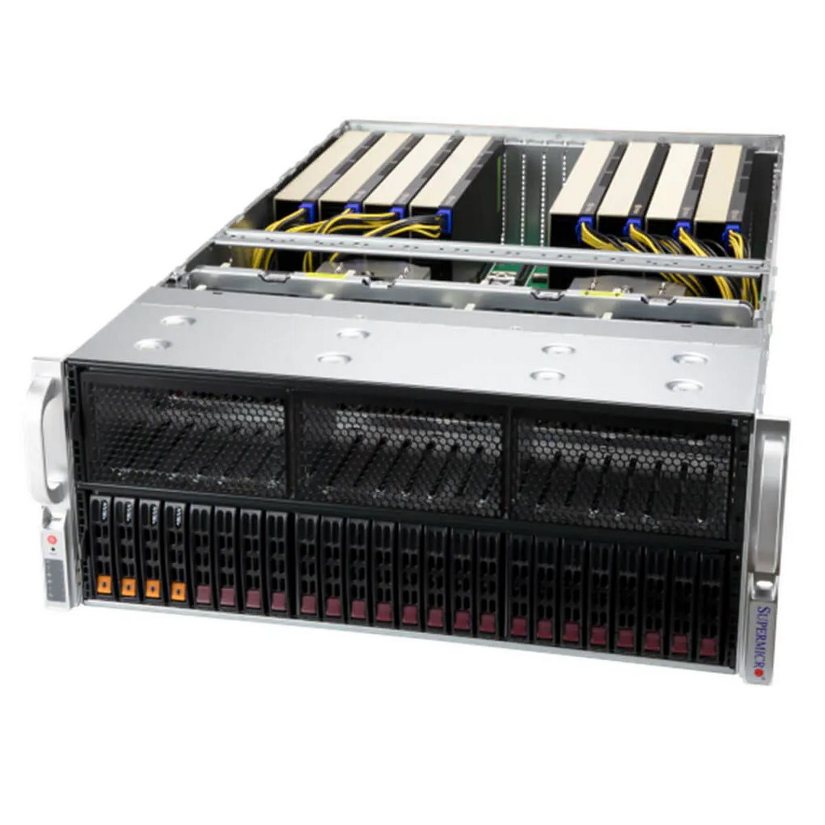 VFG-AS -4125GS-TNRT-2176 или VFG-AS -4125GS-TNRT-2275. Девять слотов PCIe5.0 x16 FHFL. Поддержка до восьми двухслотовых GPU: NVIDIA PCIe H100 NVL, H100, RTX 4000 SFF Ada Generation, L40, RTX A5500, RTX A4000, RTX 6000, RTX 5000, L40S, A40, A30, A100 и AMD PCIe Instinct MI210
