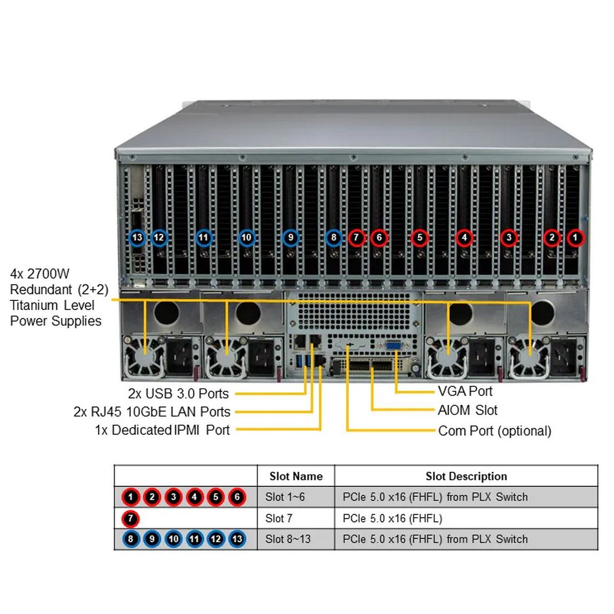 Поддержка CPU с TDP до 385Вт c СЖО. Установка до 10 GPU NVIDIA PCIe H100 NVL, H100, L40S, A100. 5 сдвоенных 80мм вентиляторов.