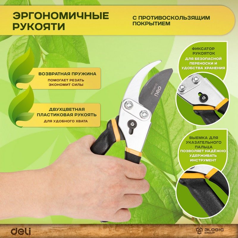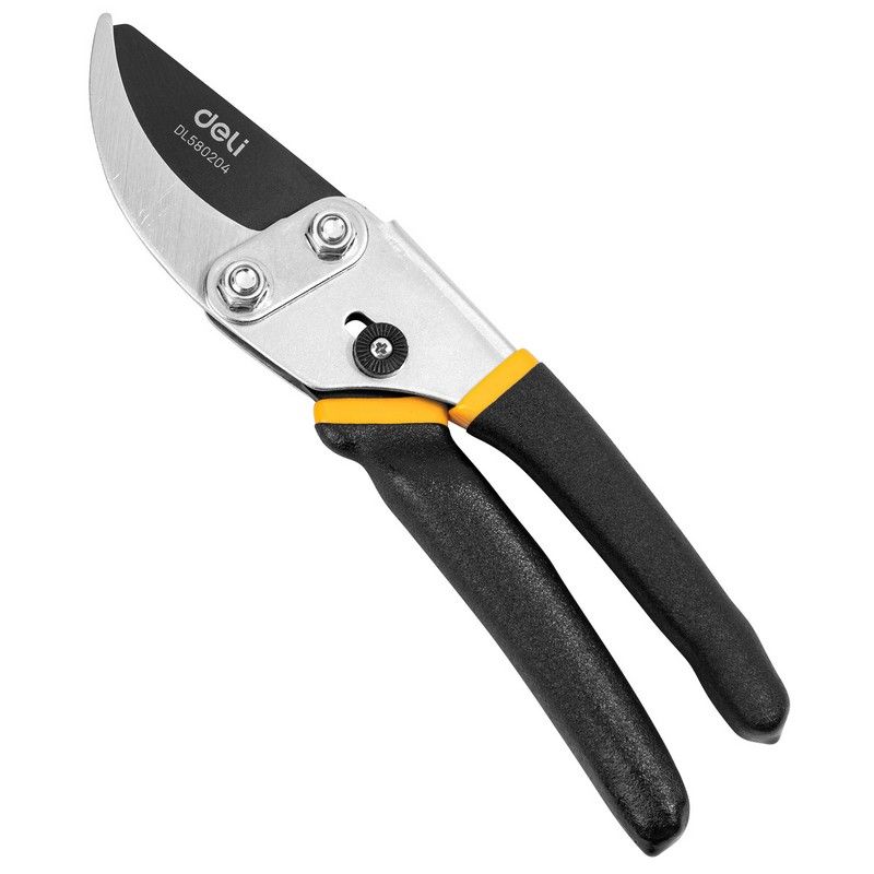 Секатор садовый Deli DL580204 лезвия с тефлоновым покрытием, длина 200мм, макс.диаметр резки 15мм, сталь 55С