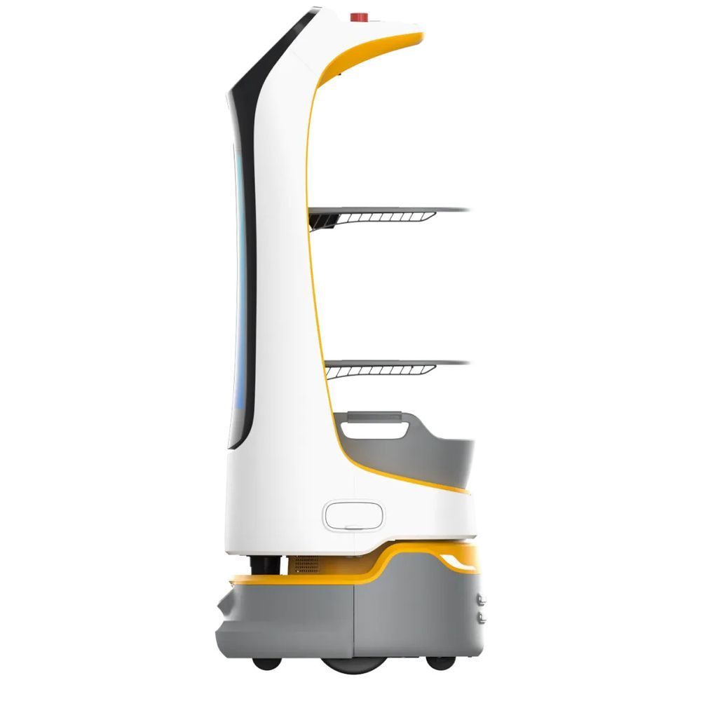 Для использования внутри помещений. Режимы: привлечение клиентов, сопровождение, «круиз», доставка и «день рождения». Распознавание лиц. Широкоугольная камера типа "рыбий глаз". Съемные лотки (полки): 352x340мм. Расстояние между лотками (сверху вниз): 248/253/223мм. Датчики лотков. Минимальный коридор для проезда: 55см (низ)/52см (верх). Предупреждение о низком уровне заряда аккумулятора и автоматическая подзарядка.
