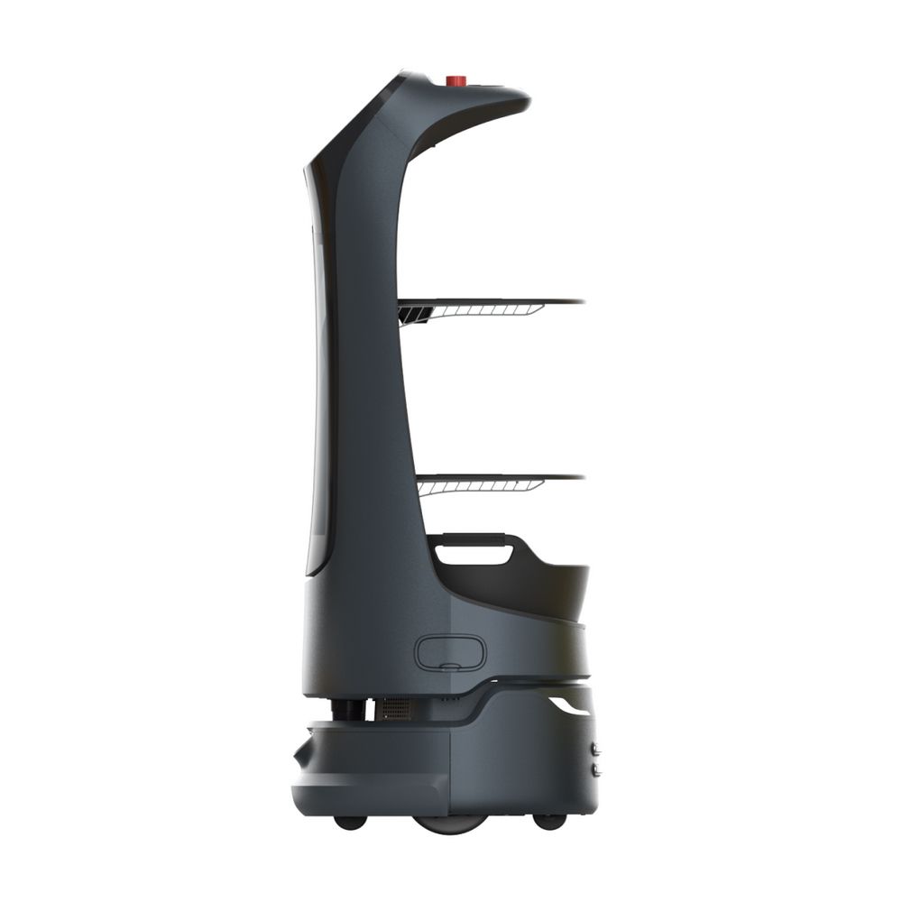 Для использования внутри помещений. Режимы: привлечение клиентов, сопровождение, «круиз», доставка и «день рождения». Распознавание лиц. Широкоугольная камера типа "рыбий глаз". Съемные лотки (полки): 352x340мм. Расстояние между лотками (сверху вниз): 248/253/223мм. Датчики лотков. Минимальный коридор для проезда: 55см (низ)/52см (верх). Предупреждение о низком уровне заряда аккумулятора и автоматическая подзарядка.