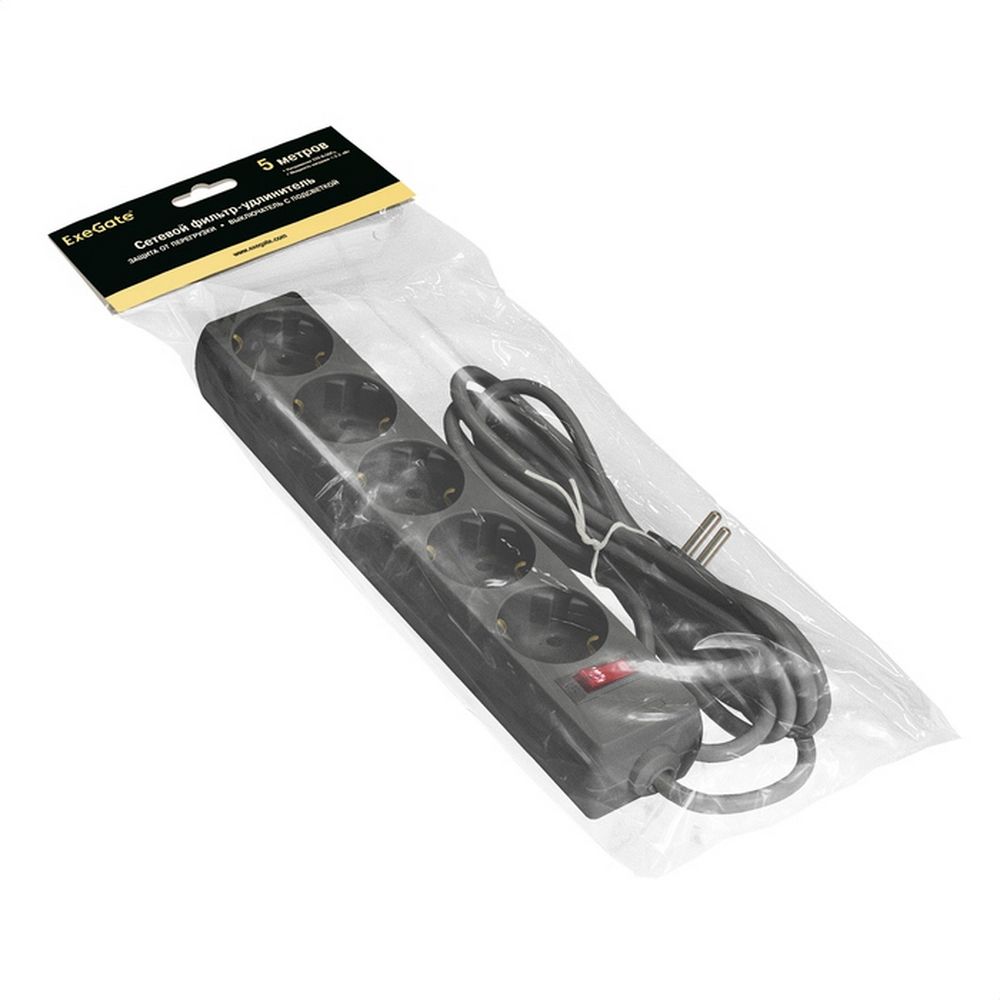 Сетевой фильтр Exegate Сетевой фильтр ExeGate SP-5-5B (5 евророзетки с заземлением, 5м, защита от перегрузки, выключатель с подсветкой, черный)