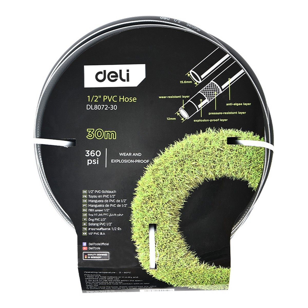 Шланг поливочный армированный Deli DL8072-30 30 метров, 1/2", 4 слоя, давление до 25 бар, серый