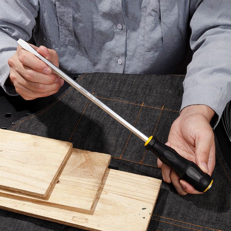 Ударная шлицевая отвёртка со сквозным хвостовиком Deli — это незаменимый инструмент для любого мастера. Она предназначена для закручивания и откручивания крепёжных элементов с прямым шлицем.