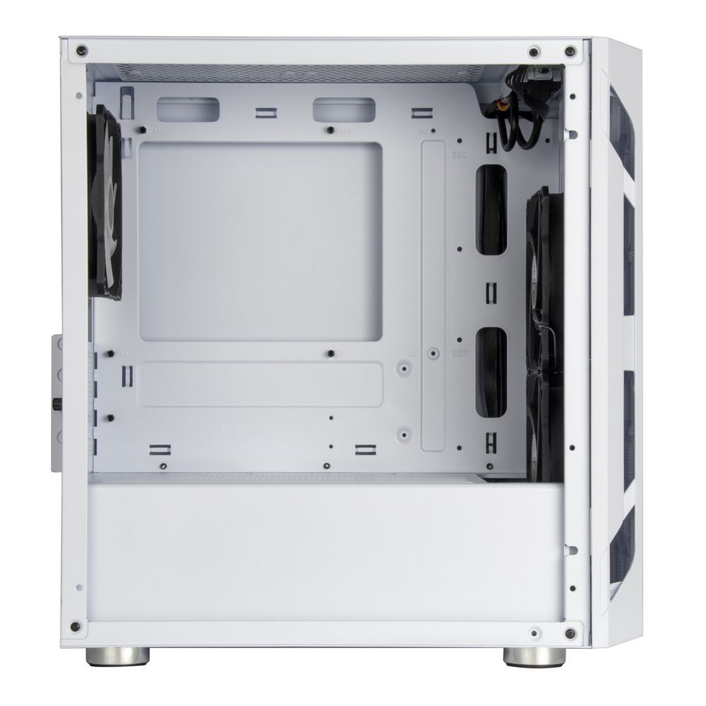 Корпус имеет стильный дизайн с использованием белого цвета и закалённого стекла. Он оснащён несколькими отсеками для жёстких дисков и SSD, а также поддерживает установку нескольких видеокарт. Корпус обеспечивает хорошую вентиляцию и охлаждение благодаря встроенным вентиляторам и возможности установки дополнительных.