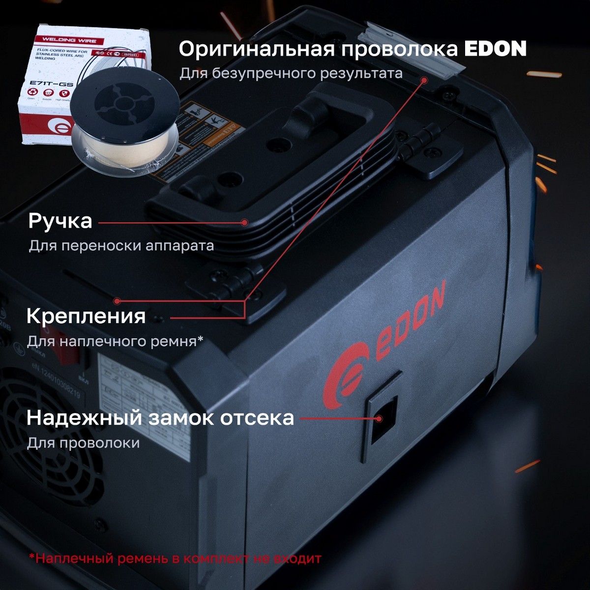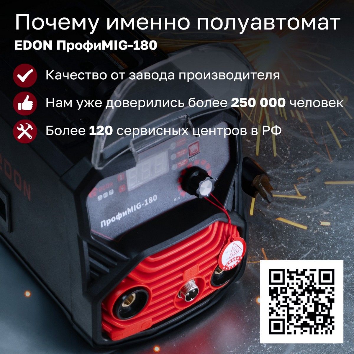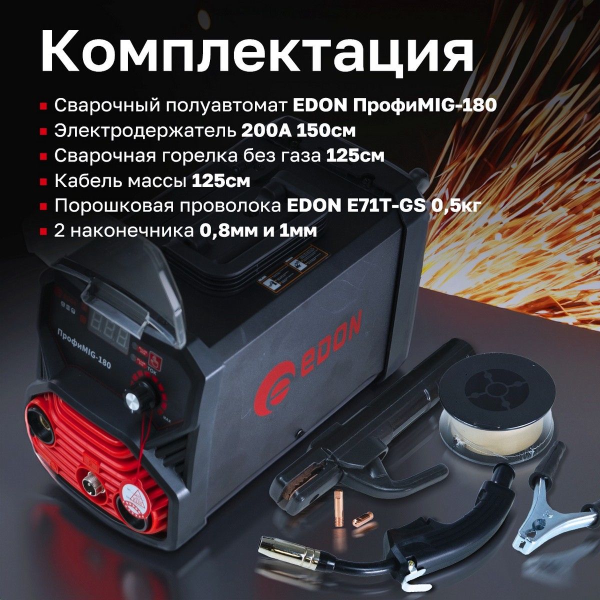 Сварочный аппарат полуавтоматический Edon ПрофиMIG-180 MIG 6,7кВт 20-180А, MMA 7,9кВт 20-180А, раб.цикл 60%, КПД 85%, диаметр: электроды 2-4мм, проволока 0,8-1мм