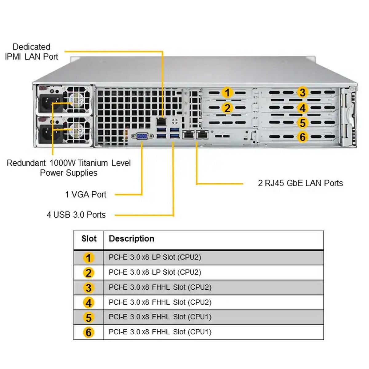 Поддержка процессоров Intel Xeon Scalable 1-го и 2-го поколения с TDP до 205W. Два слота PCIe x8 - LP, один слот PCIe x16 - для AOM. Предустановленный 8-портовый 3.5" 2U Backplane SAS3/SATA3 12Gbps TQ