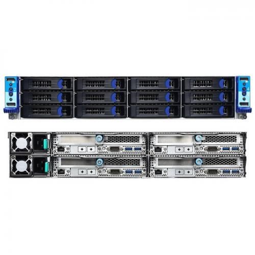 Четырехмодульная серверная платформа. Характеристики процессоров, оперативной памяти, чипсета, слотов расширения, портов для накопителей, а также портов ввода/вывода и систем охлаждения приведены для одного модуля.