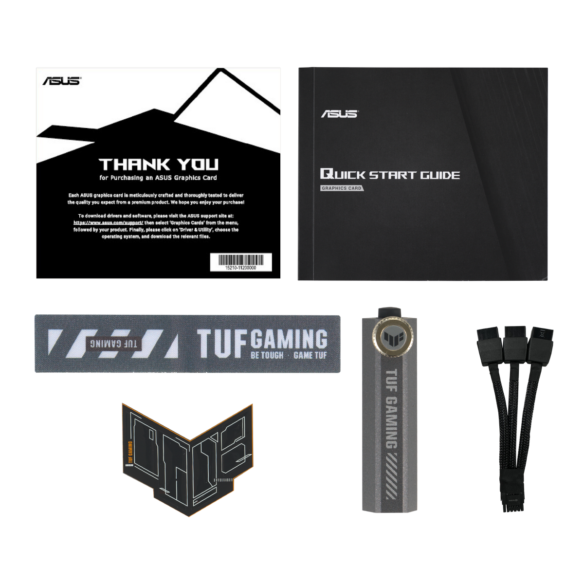 Видеокарта, кабель-адаптер питания, держатель видеокарты (опция), стикеры, документация