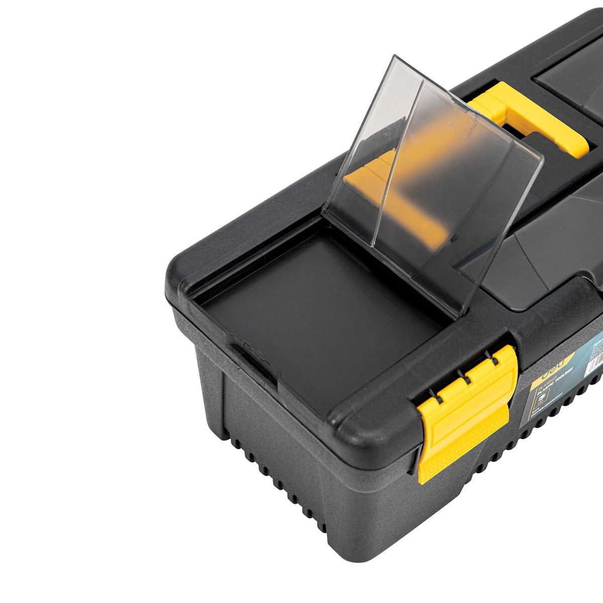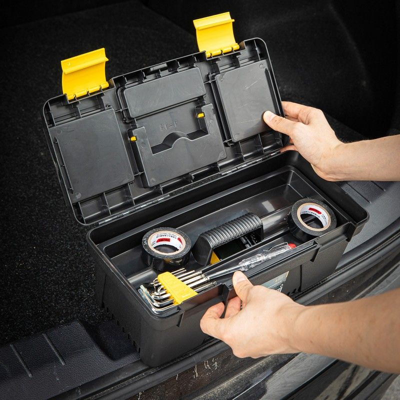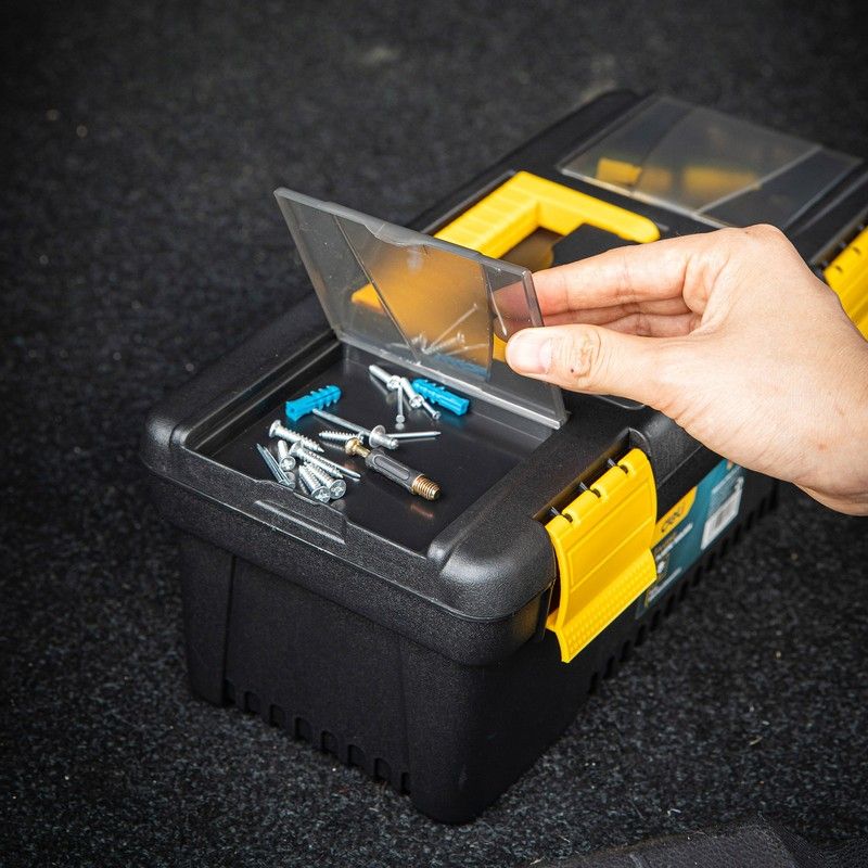 Ящик оснащён удобной ручкой для переноски и надёжными защёлками, которые обеспечивают безопасное хранение инструментов внутри контейнера. Благодаря компактным размерам ящик легко помещается в багажник автомобиля или на полку мастерской.