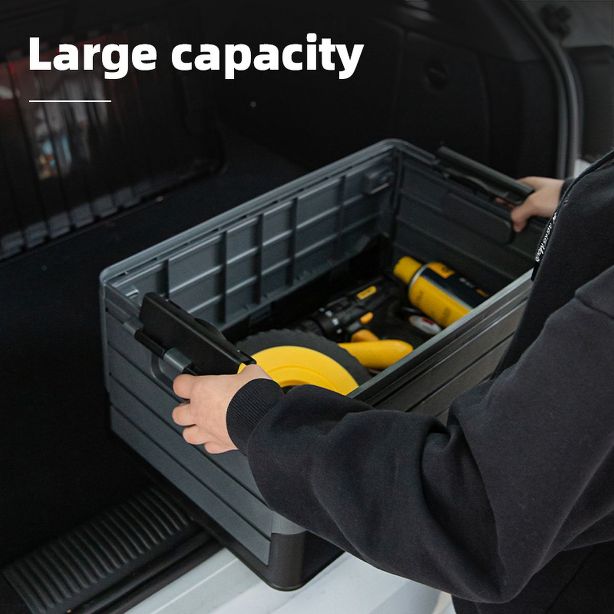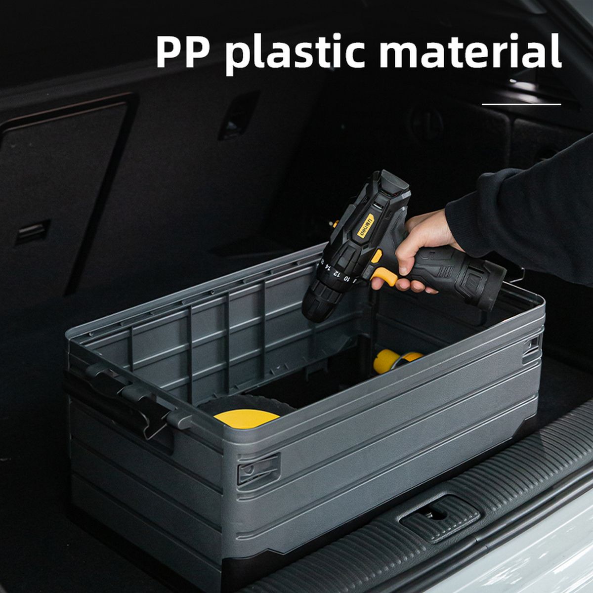 Ящик изготовлен из прочного материала, устойчивого к ударам и царапинам. Он имеет удобную ручку для переноски и надёжные замки, которые обеспечивают сохранность содержимого. Благодаря складной конструкции ящик не занимает много места при хранении.